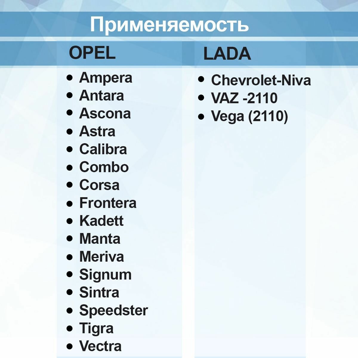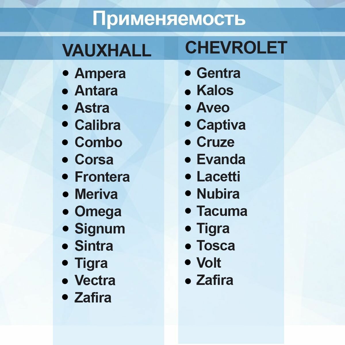 | Модель автомобиля | Chevrolet Aveo / Chevrolet Captiva / Chevrolet Cruze / Chevrolet Kalos / Chevrolet Lacetti / Chevrolet Lanos / Chevrolet Niva / Chevrolet Rezzo / Daewoo Espero / Daewoo Evanda / Daewoo Leganza / Daewoo Nexia / Daewoo Nubira / Fiat Croma / LADA 2121 / Lotus Europa S / Opel Antara / Opel Astra / Opel Astra H / Opel Combo / Opel Corsa / Opel Frontera / Opel Kadett / Opel Meriva / Opel Omega / Opel Rekord / Opel Signum / Opel Speedster / Opel Tigra / Opel Vectra / Opel Zafira / Saab 09-3x |