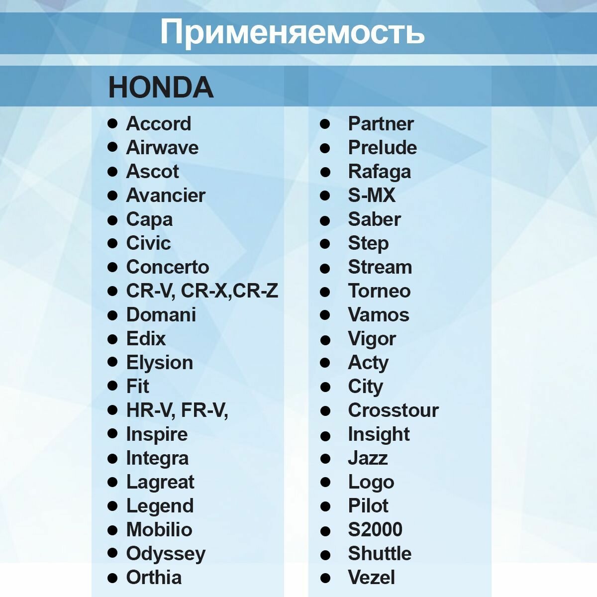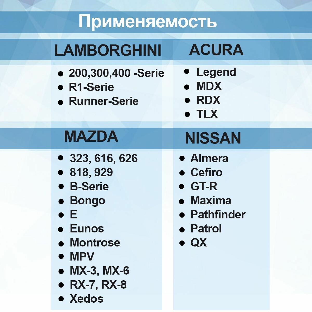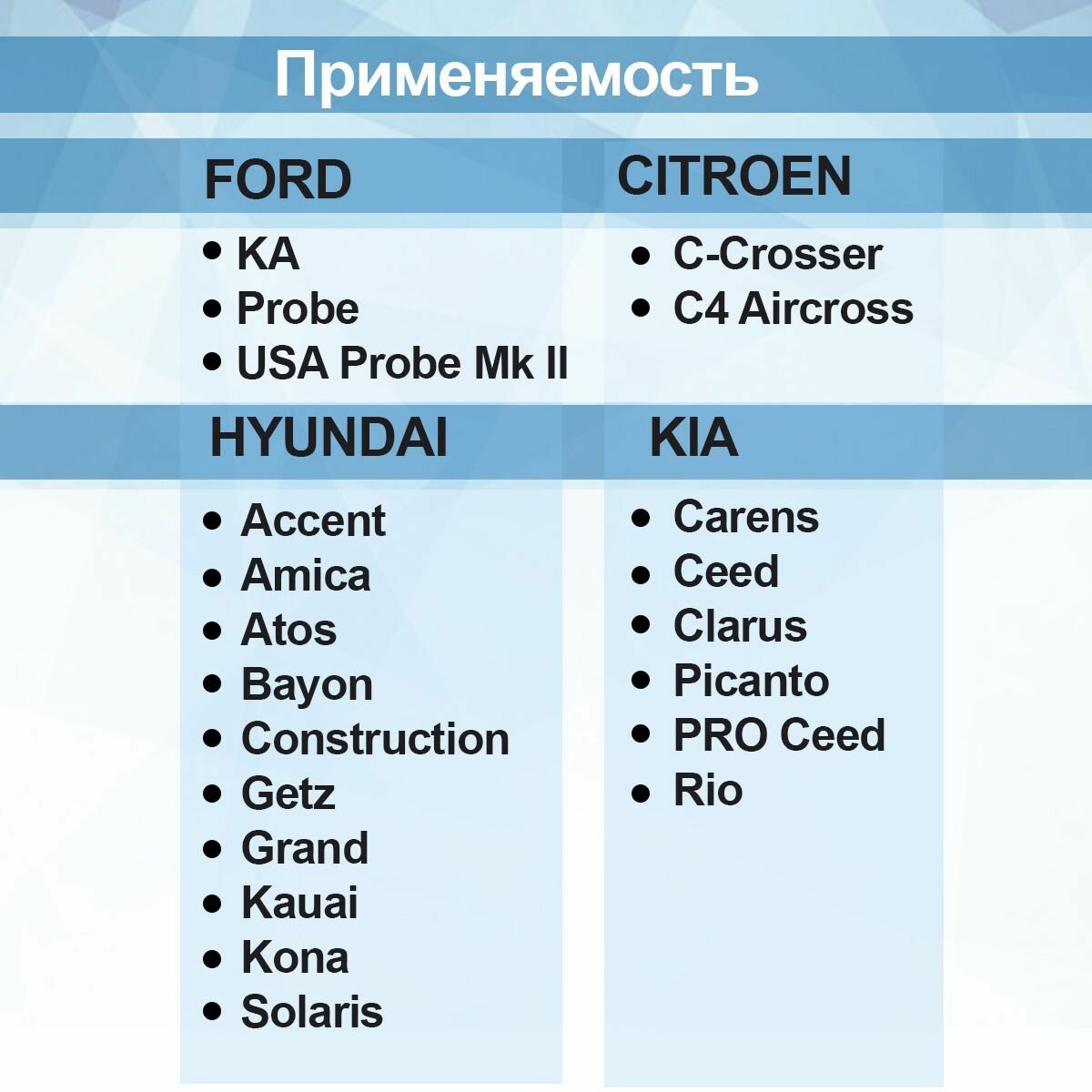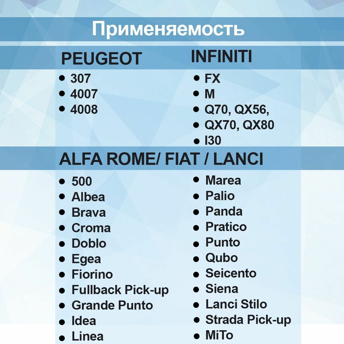 | Модель автомобиля | Alfa Romeo MiTo / Chery Eastar / Chery Tiggo / Citroen C-Crosser / Citroen C4 Aircross / Fiat 500 / Fiat Albea / Fiat Bravo / Fiat Croma / Fiat Doblo / Fiat Idea / Fiat Linea / Fiat Marea / Fiat Palio / Fiat Panda / Fiat Punto / Fiat Qubo / Fiat Siena / Fiat Strada / Great Wall Hover / Great Wall Hover M2 / Honda Accord / Honda Civic / Honda HR-V / Hyundai Solaris / Hyundai i10 / Hyundai i20 / Hyundai i30 / Infiniti QX4 / Kia Carnival / Kia Ceed / Kia Picanto / Kia Rio / Kia Stonic / Lancia Musa / Lancia Ypsilon / Mazda 626 / Mazda 929 / Mazda B-Series / Mazda RX-7 / Mercury Mariner / Mitsubishi ASX / Mitsubishi Carisma / Mitsubishi Colt / Mitsubishi Galant / Mitsubishi L200 / Mitsubishi Lancer / Mitsubishi Outlander / Mitsubishi Pajero / Mitsubishi Space Gear / Mitsubishi Space Star / Nissan Maxima / Nissan Pathfinder / Nissan Terrano / Opel Combo / Opel Corsa / Opel Vectra / Peugeot 4007 / Peugeot 408 / Subaru Forester / Subaru Outback / Subaru XV / Volvo S40 / Volvo V40 |