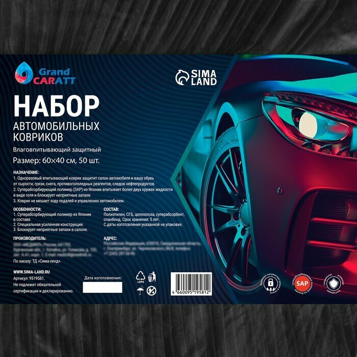 Автомобильные коврики Grand Caratt Влаговпитывающие, 4 шт по 40х60 см, 1 шт 60х120 см, водонепроницаемые, 5 шт