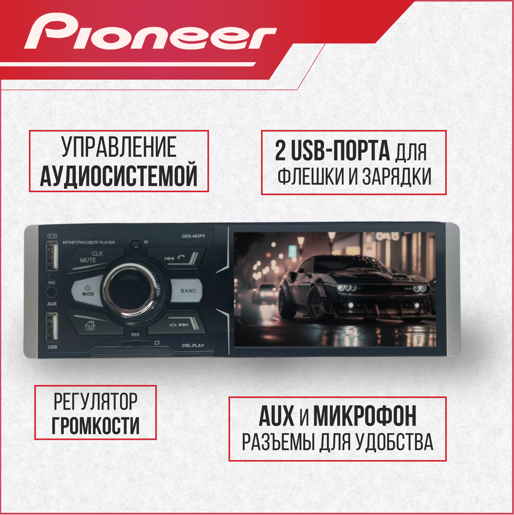 Магнитола автомобильная, автомагнитола 1 дин Pioneer MVH-463, автомагнитола USB, AUX на передней панели, автомагнитола с блютуз, подсветка интересное: