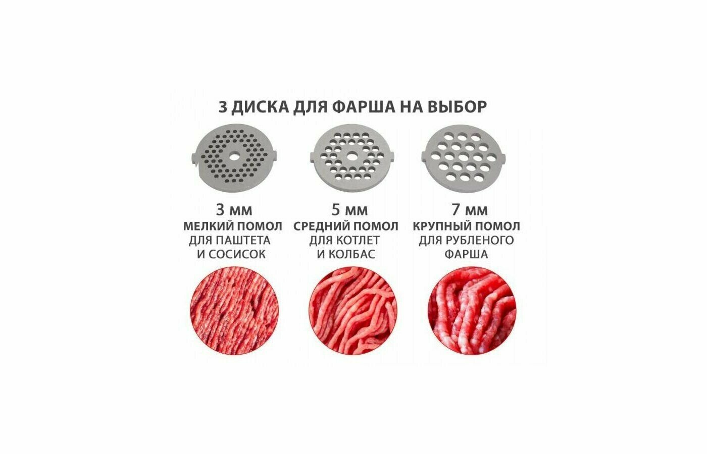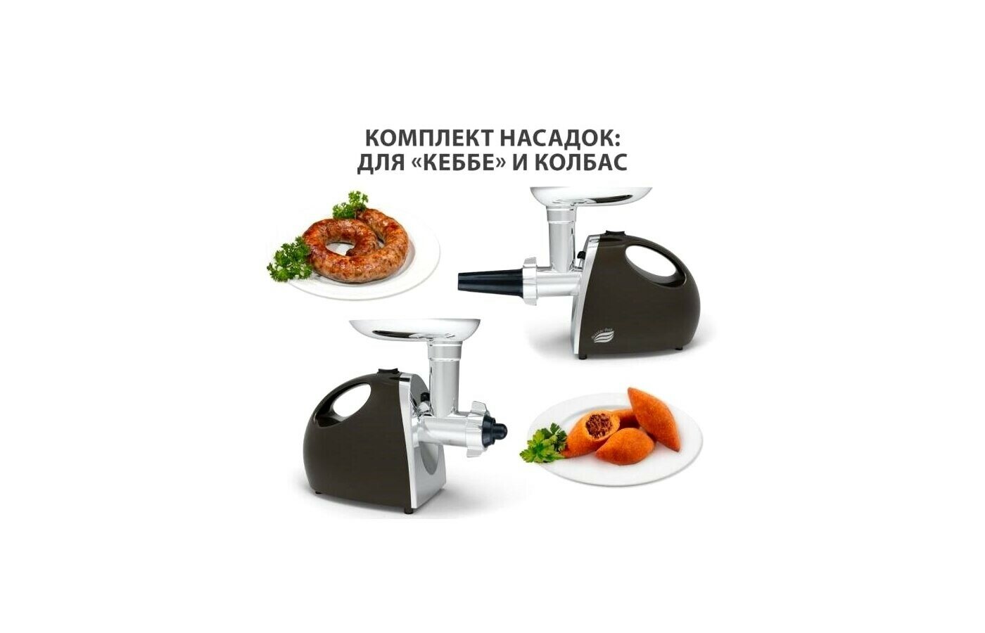 | Насадки | диск для фарша / насадка для кеббе / насадка для приготовления колбас / насадка для шинковки / соковыжималка |