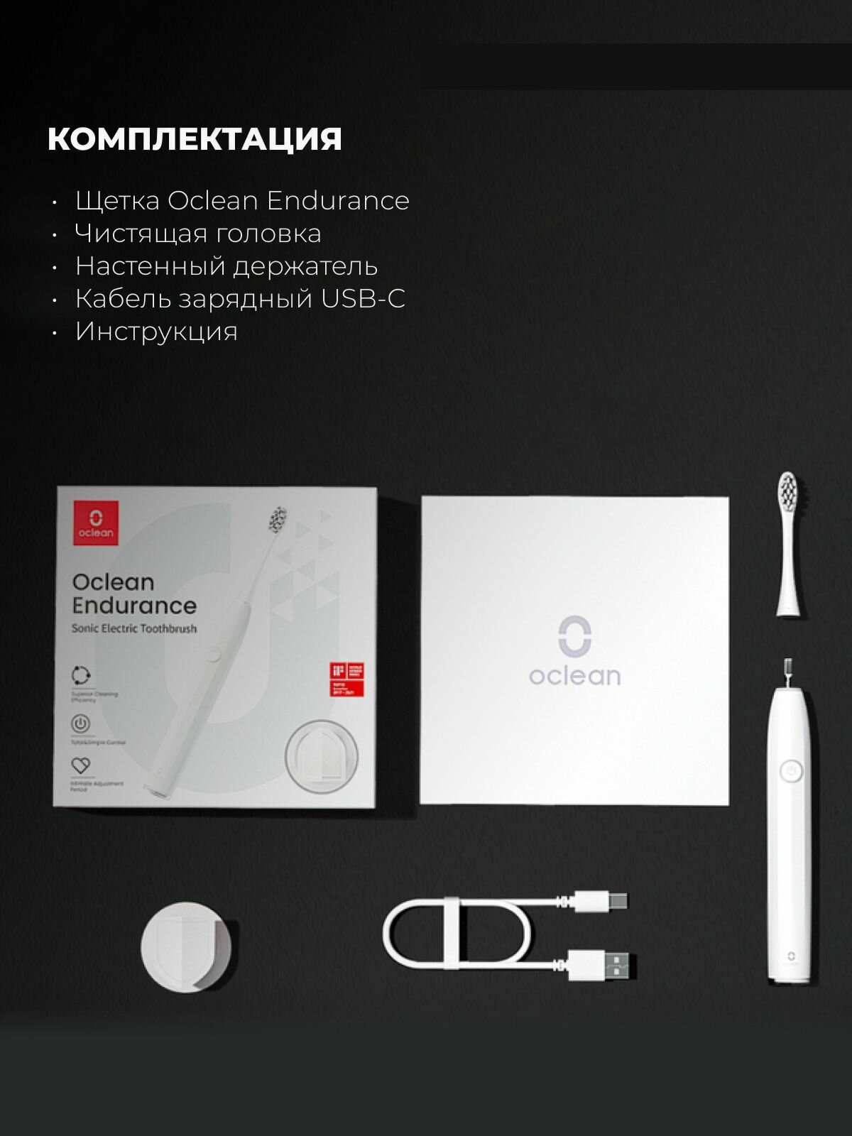 | Подробная комплектация | Электрическая зубная щетка Oclean Endurance Eco - 1шт; кабель питания - 1 шт; магнитный держатель на стену - 1 шт; насадка - 1 шт; документация. |