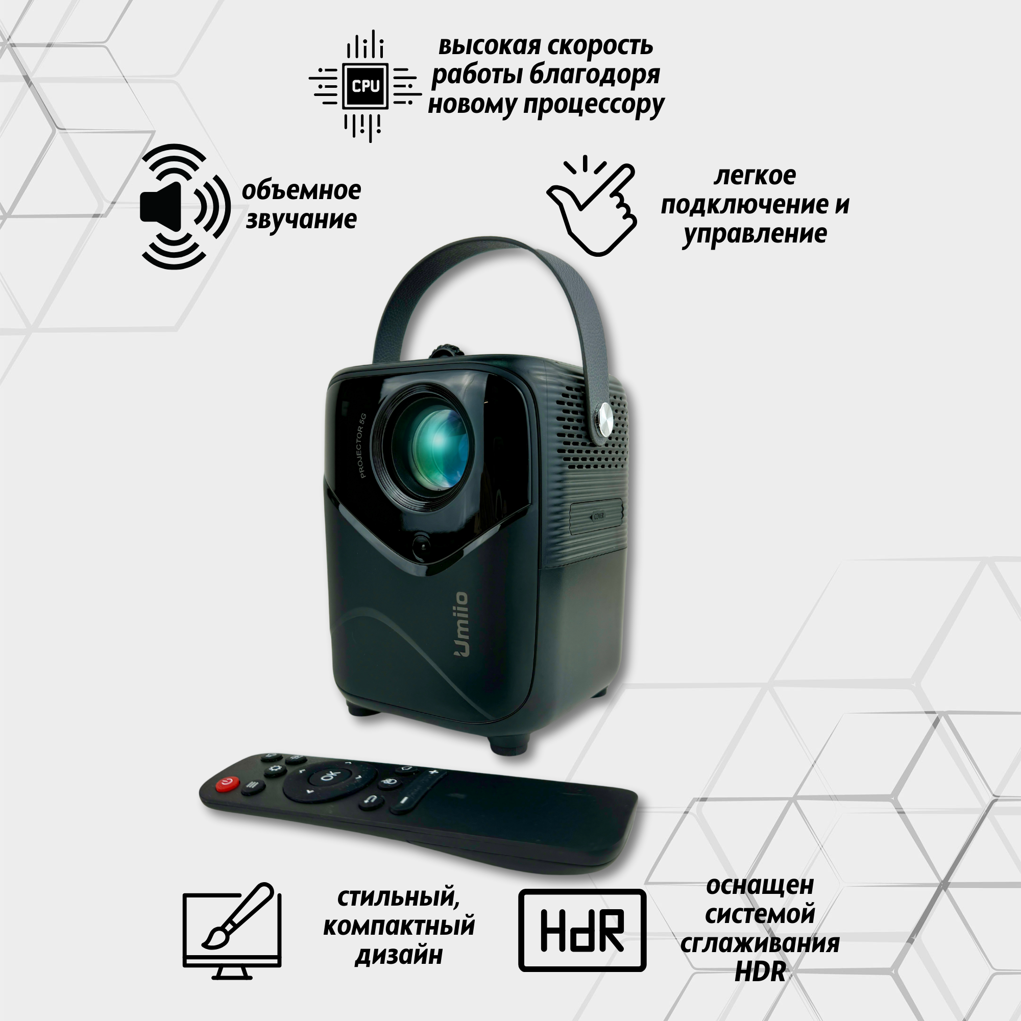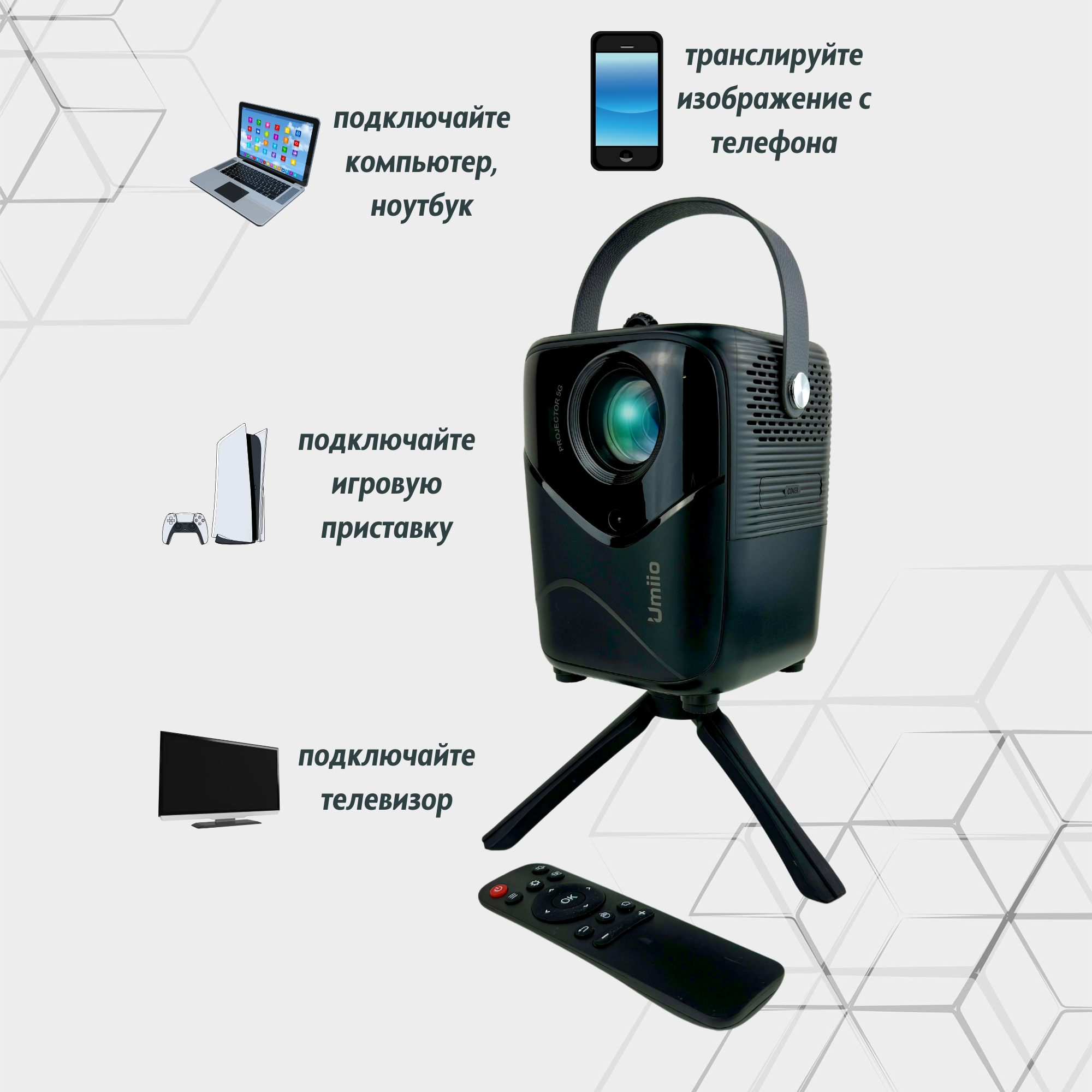 Проектор UMIIO Q2 HDMI для приставки и компьютера Wi-Fi 5G Bluetooth, с штативом, белый