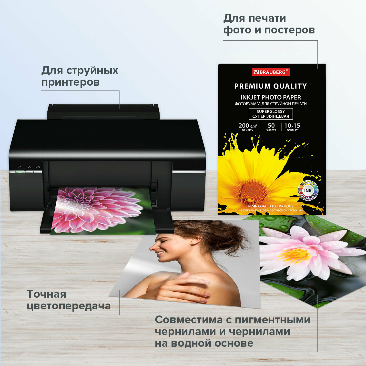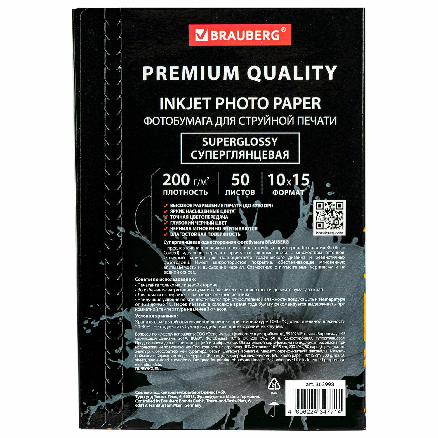 Фотобумага суперглянцевая / бумага для струйной печати Premium 10х15 см, 200 г/м2, односторонняя, 50 листов, Brauberg, 363998 интересное: