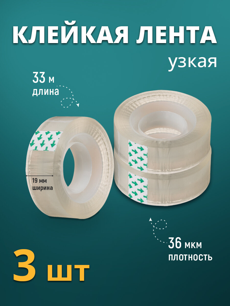 Клейкая лента 19мм х 33м канцелярская, прозрачная, комплект 3шт интересное: