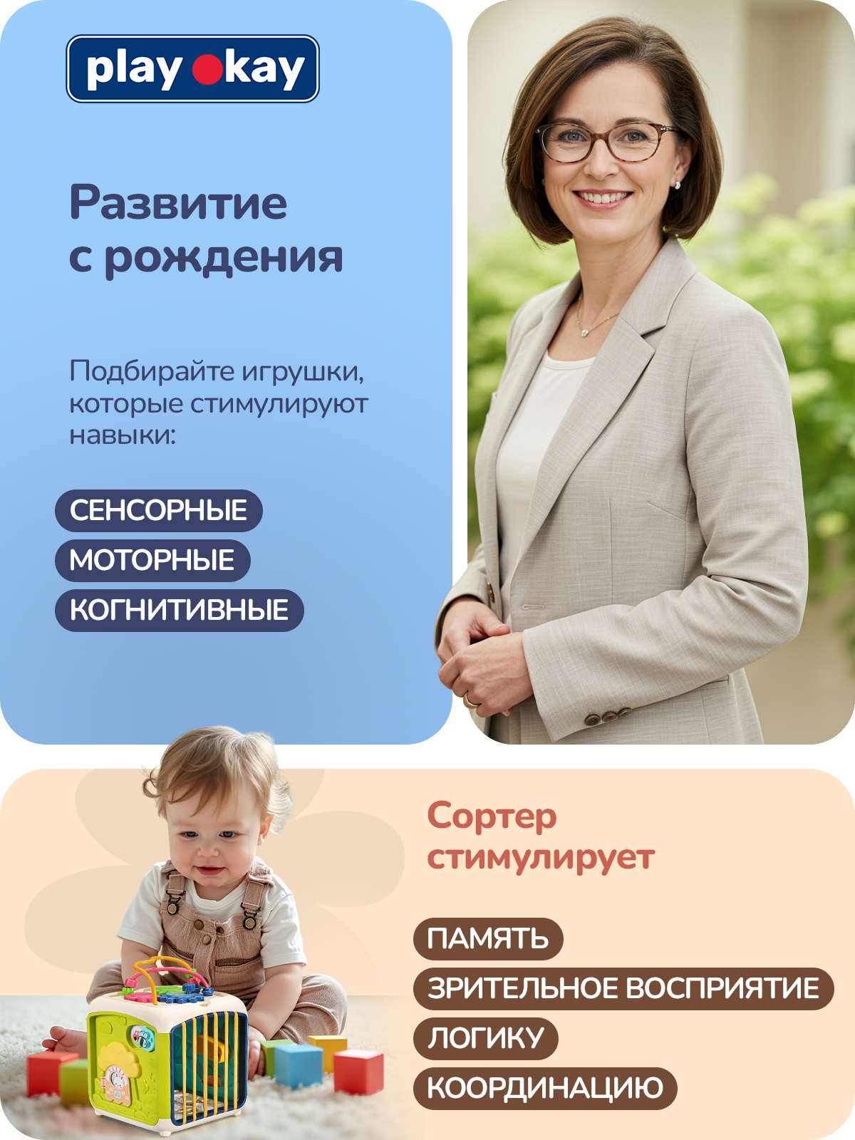 Сортер для малышей Play Okay геометрический куб головоломка, монтессори, раскладывается в доску, интеллектуальное развитие и положительные эмоции