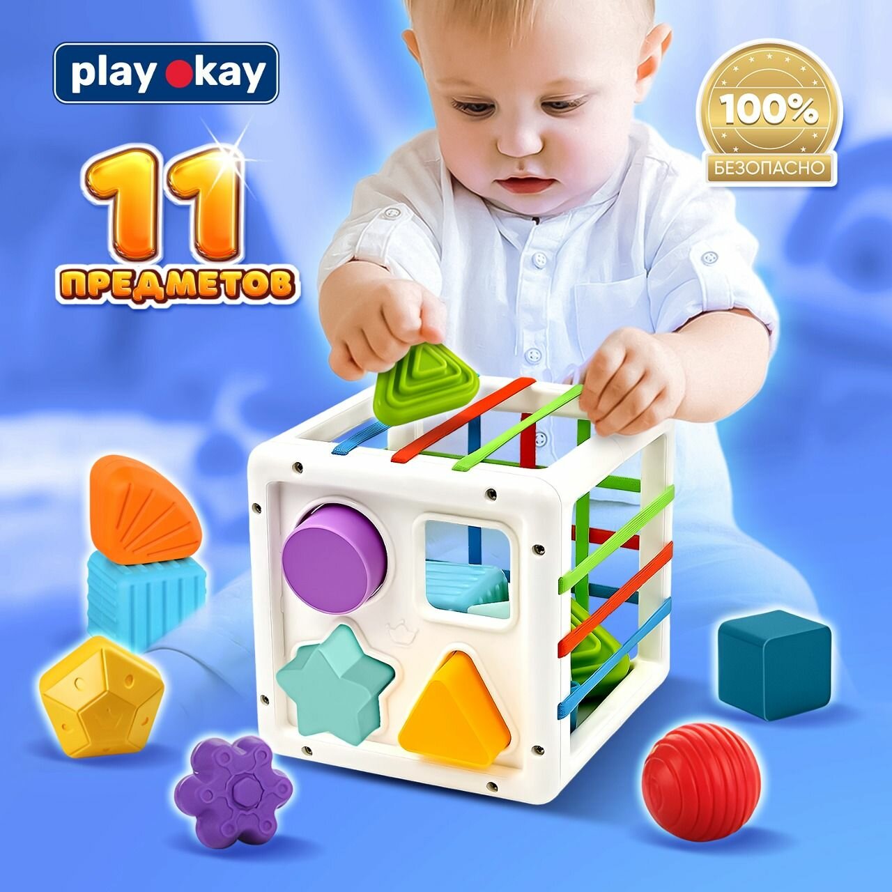 Сортер для малышей Play Okay геометрический куб головоломка, монтессори, раскладывается в доску, интеллектуальное развитие и положительные эмоции
