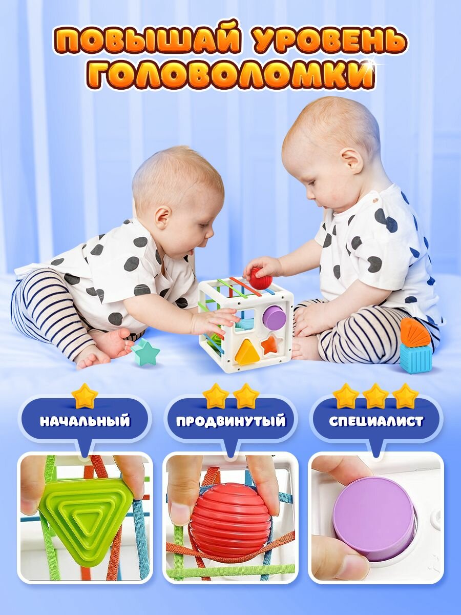 Сортер Куб по монтессори развивающий для малышей с резинками и геометрическими фигурами по цветам музыкальный