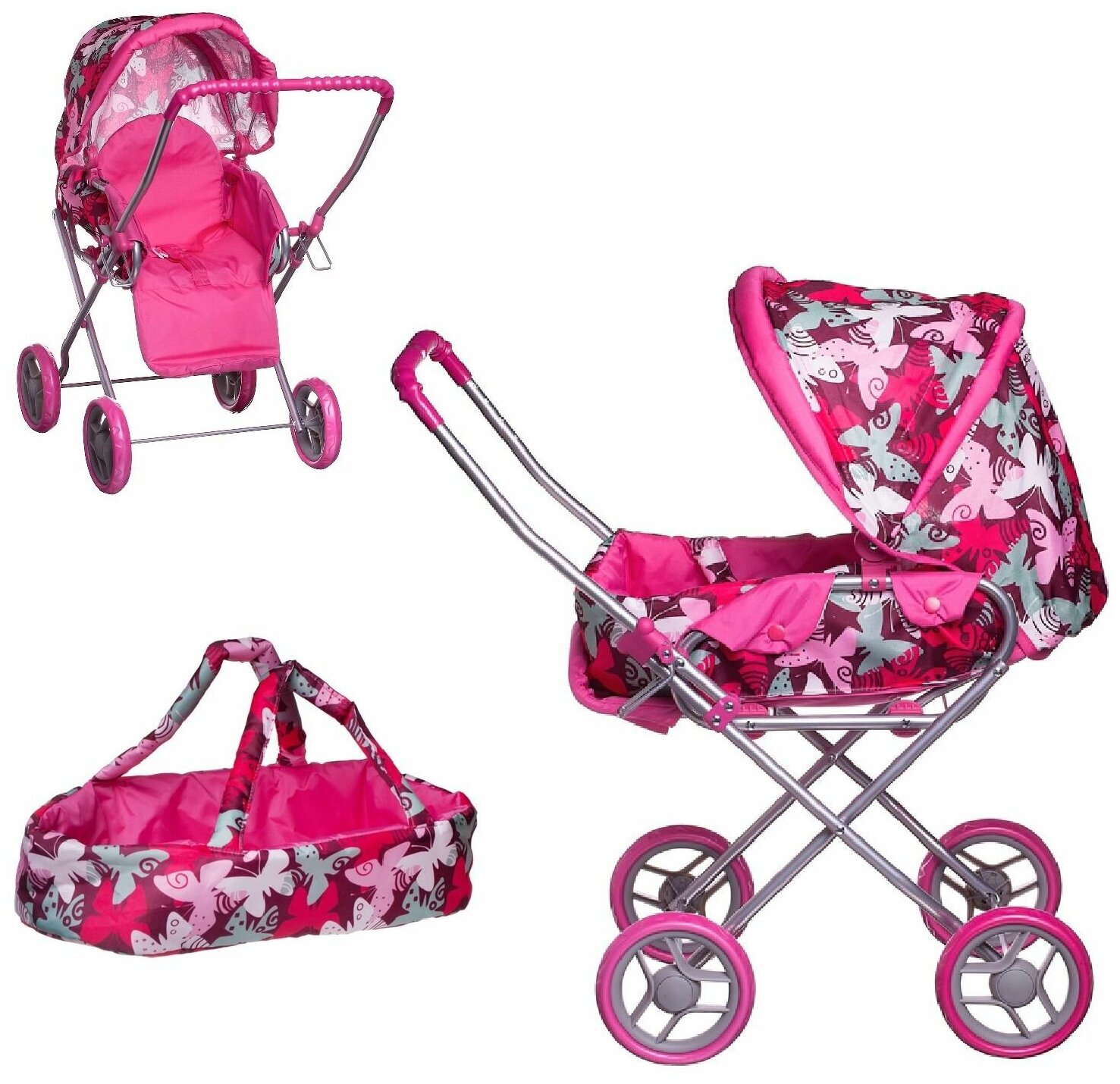 Коляска-трансформер 3в1 для куклы прогулочная со съемной люлькой, (принт бабочки), 61х35х66 см. - Abtoys
