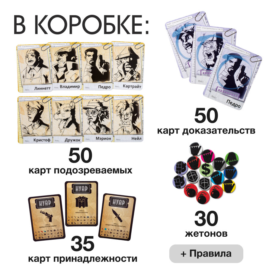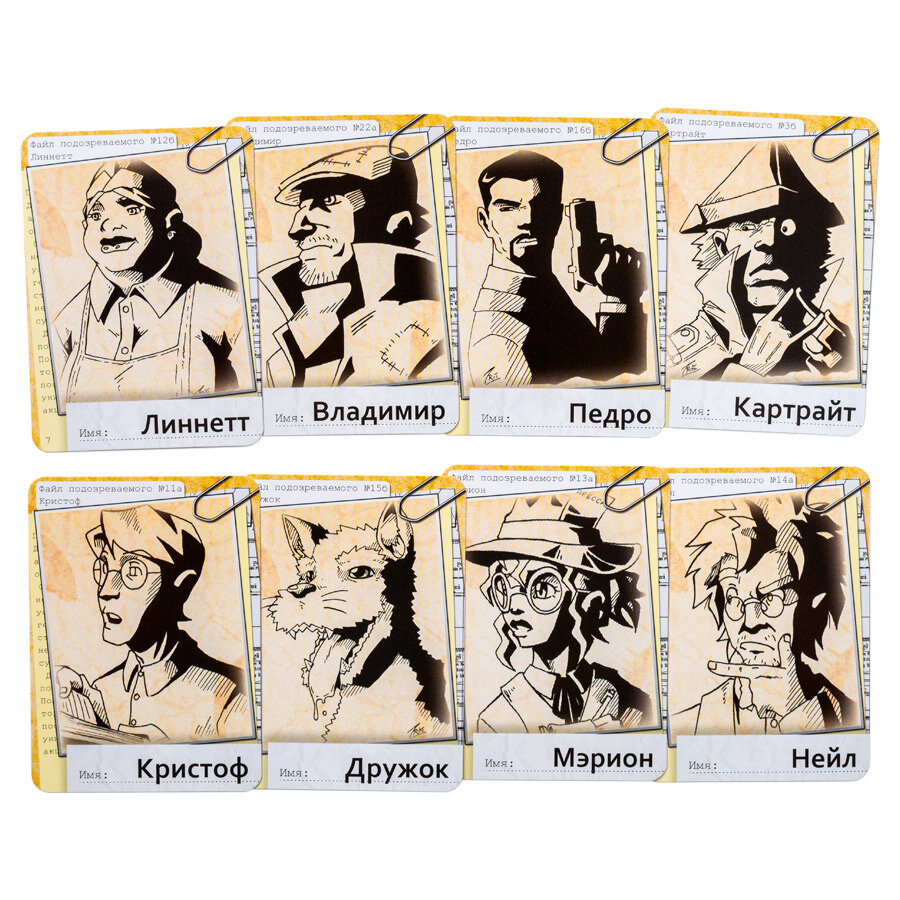 | Комплектация | 50 карт подозреваемых, 50 карт доказательств, 35 карт принадлежности, 30 жетонов, правила |