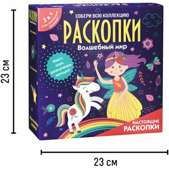 | Комплектация | деревянный молоточек, деревянный стек для дробления, окаменелый грунт, артефакты (россыпь разноцветных находок из пластика), мешочек для находок |