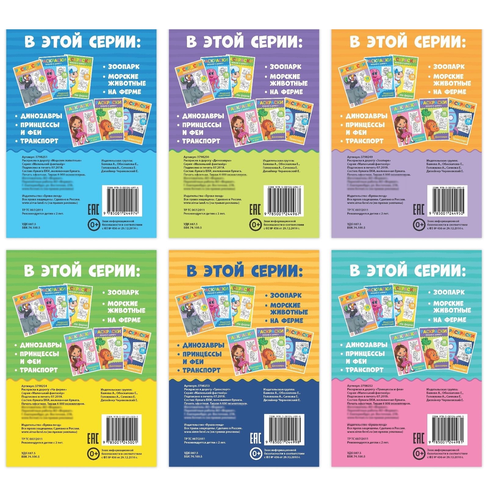 | Комплектация | Раскраска в дорогу «Транспорт». Раскраска в дорогу «Принцессы и феи». Раскраска в дорогу «Морские животные». Раскраска в дорогу «На ферме». Раскраска в дорогу «Зоопарк». Раскраска в дорогу «Динозавры» |