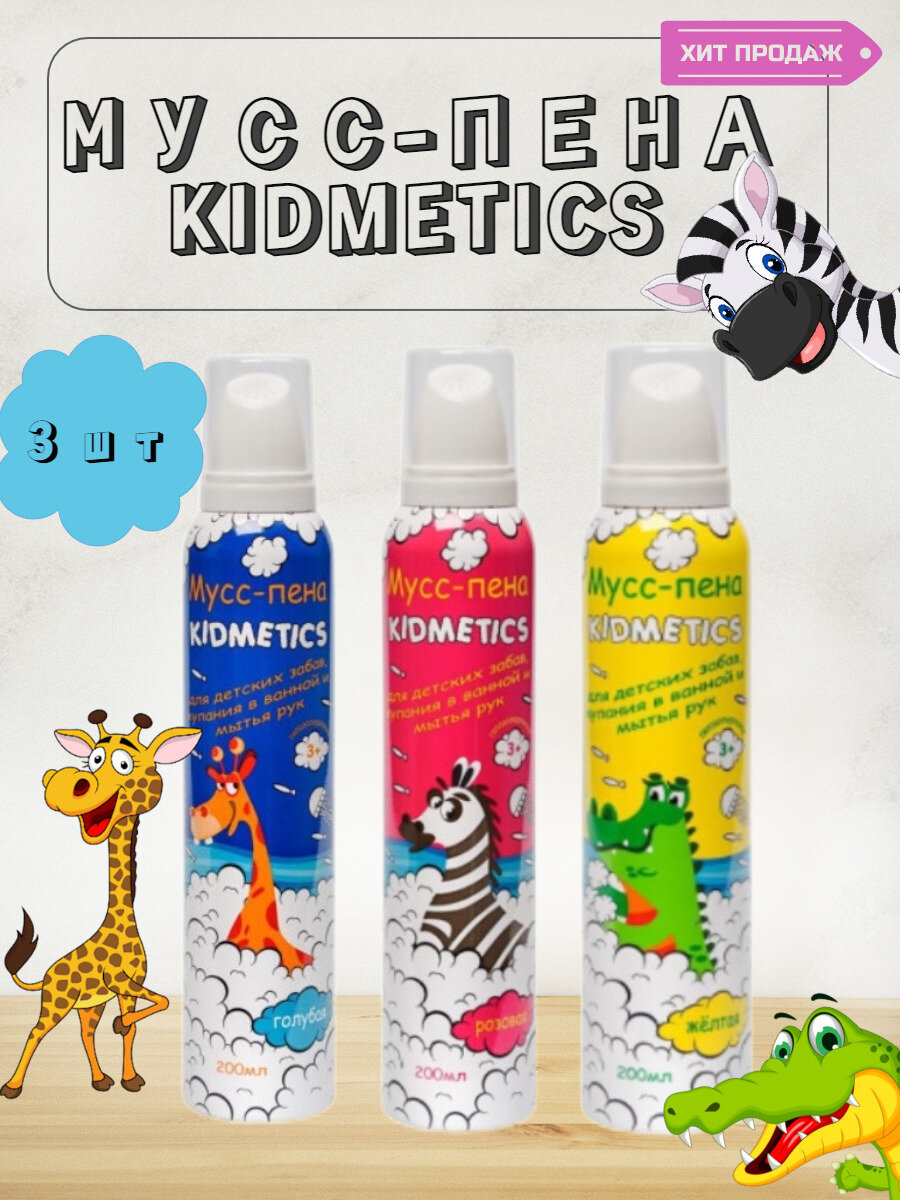KIDMETICS Пенка мусс для купания детская цветная, пена для ванны, 3 шт интересное: