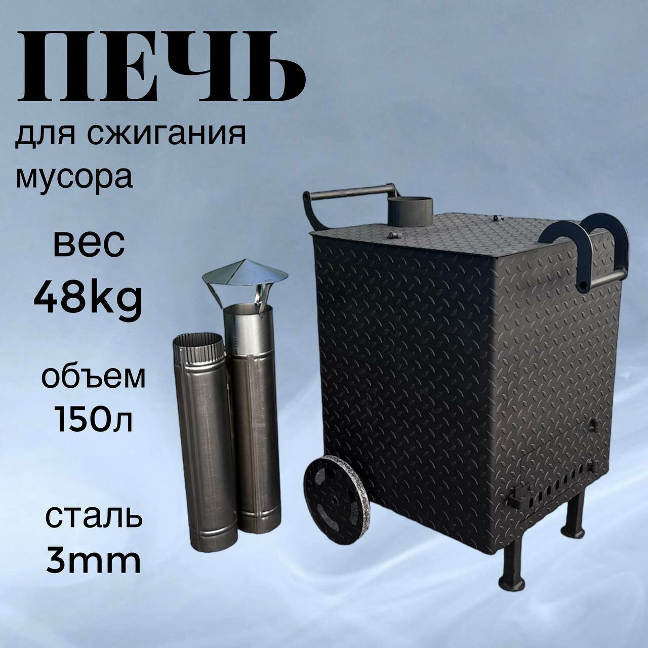 Купить Печь для сжигания мусора с колосником и дымоходом 150л, сталь 3 мм
