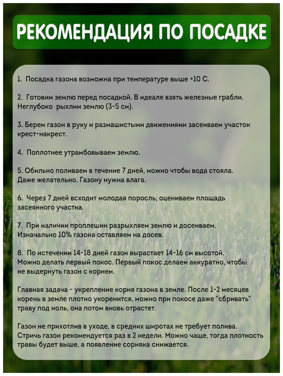 | Состав смеси | овсяница красная 10%, тимофеевка луговая 30%, райграс многолетний 15%, фестулолиум 5%, овсяница луговая 25%, клевер белый 15% |