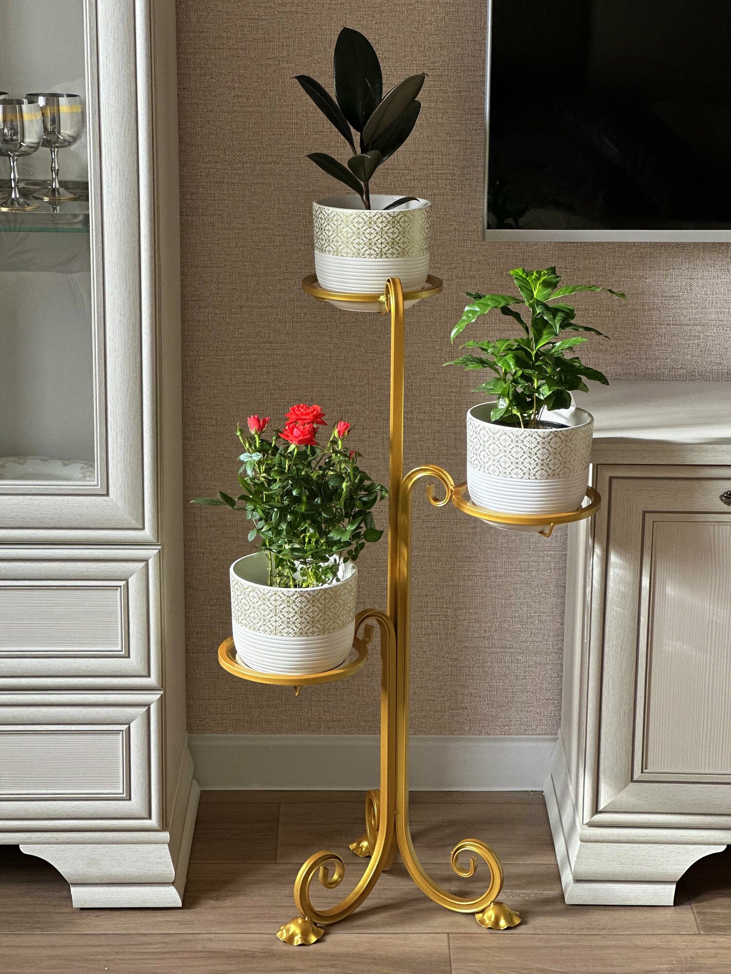 Подставка для цветов напольное, кашпо напольное для цветов, полка стеллаж под цветы 3 горшка интересное: