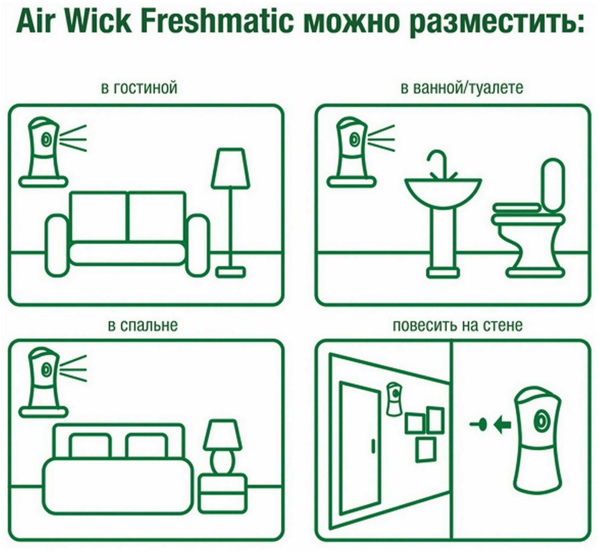 | Дополнительная информация | баллон для автоматического освежителя воздуха Air Wick Freshmatic, перед тем, как вставить аэрозоль, проверьте, что диспенсер выключен, не направляйте в лицо при включении или при установке интервала распыления, после включения распыление начнется автоматически через 15 сек |
