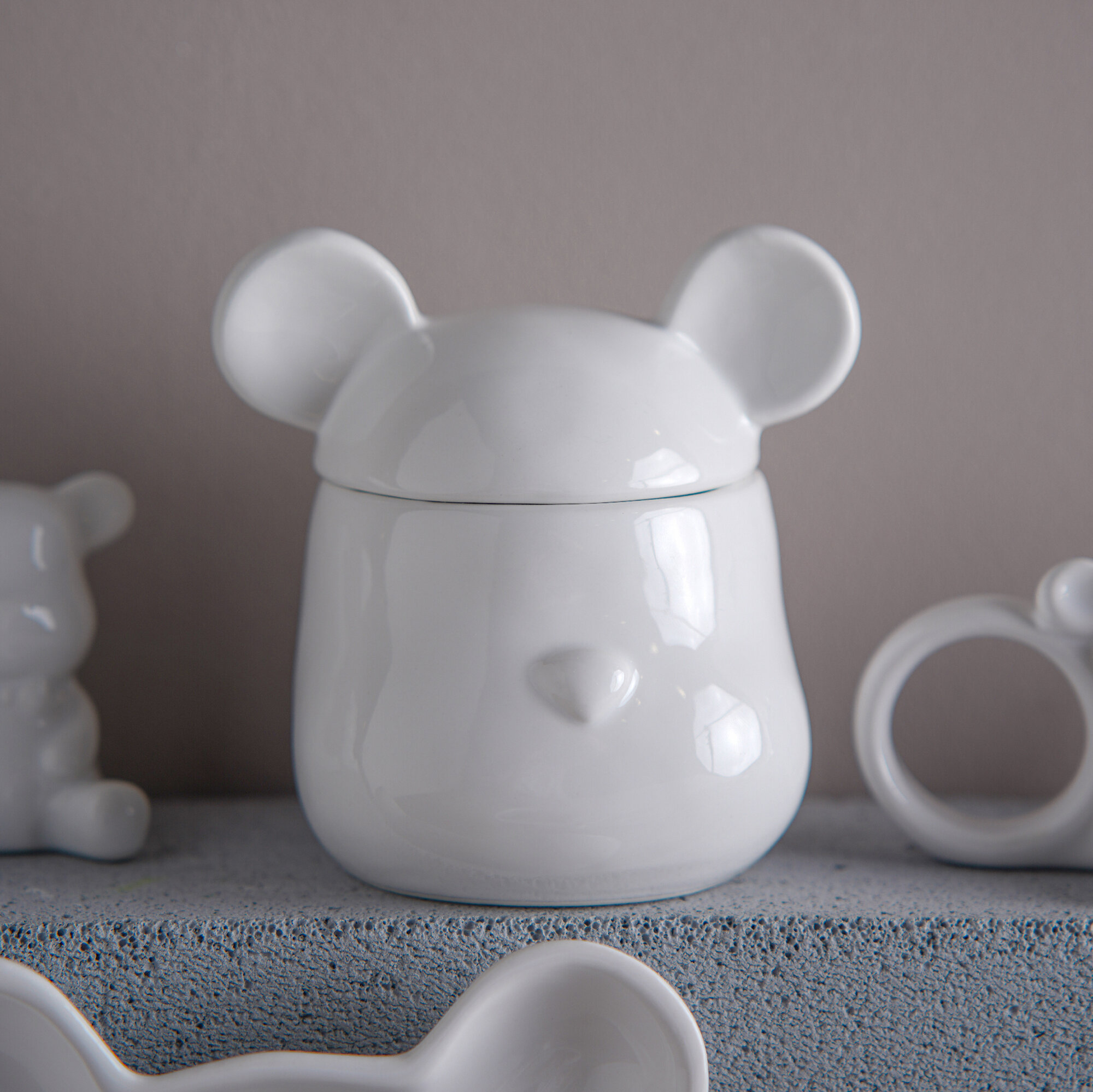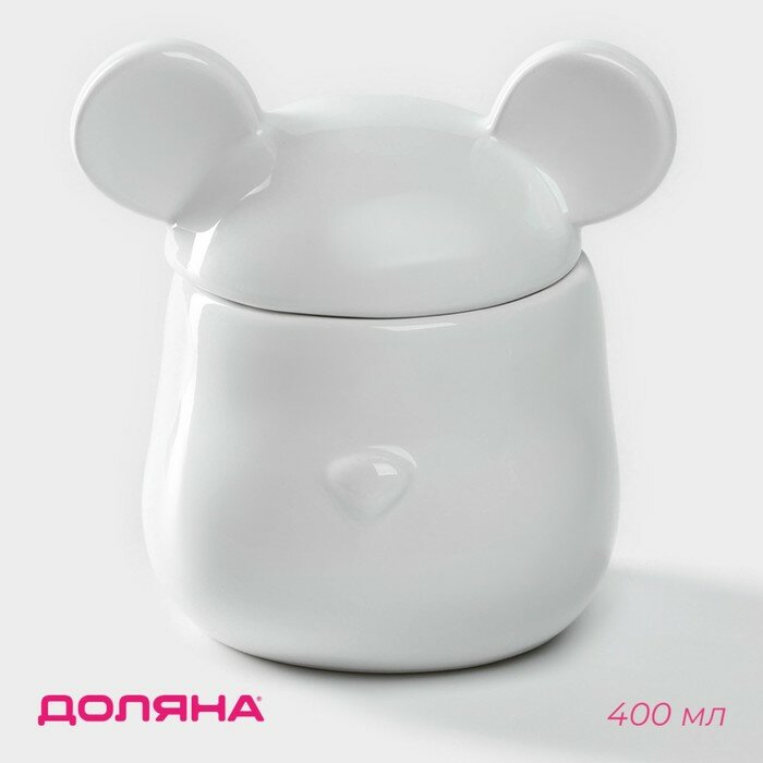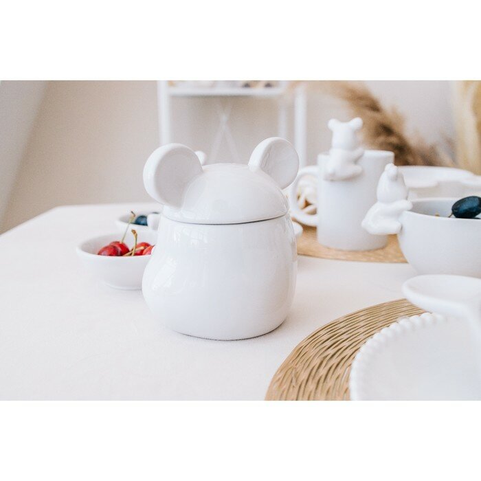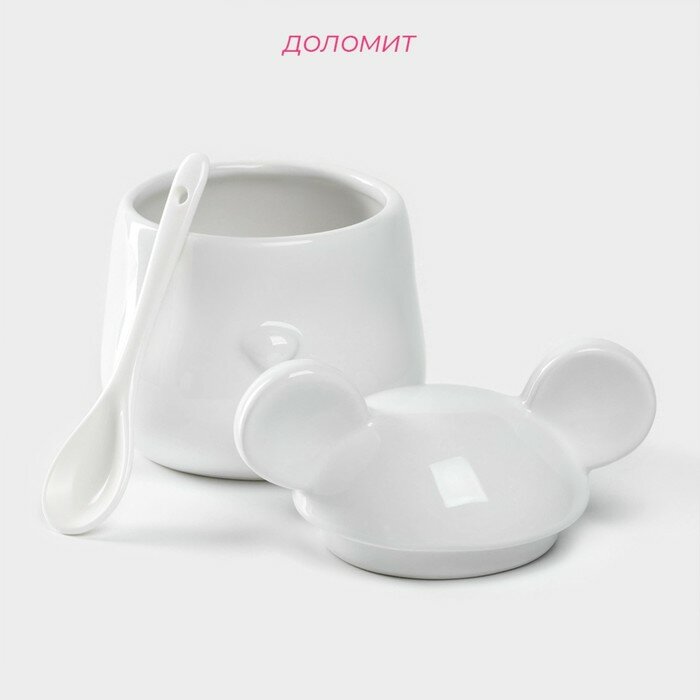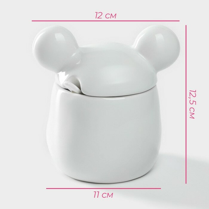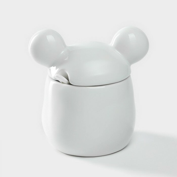Купить Сахарница керамическая для сервировки стола, с крышкой и ложкой Доляна «Мишка Отто», 400 мл, 11×12×12,5 см, цвет белый