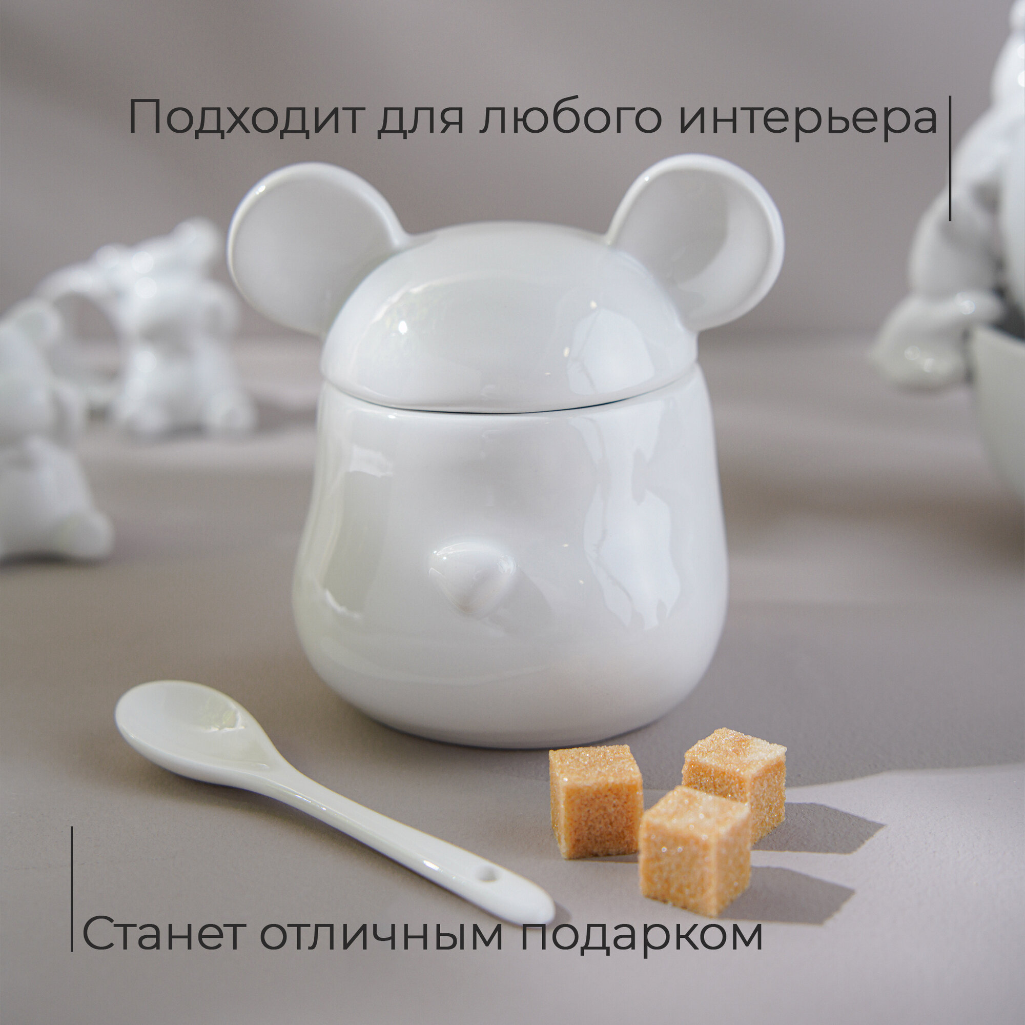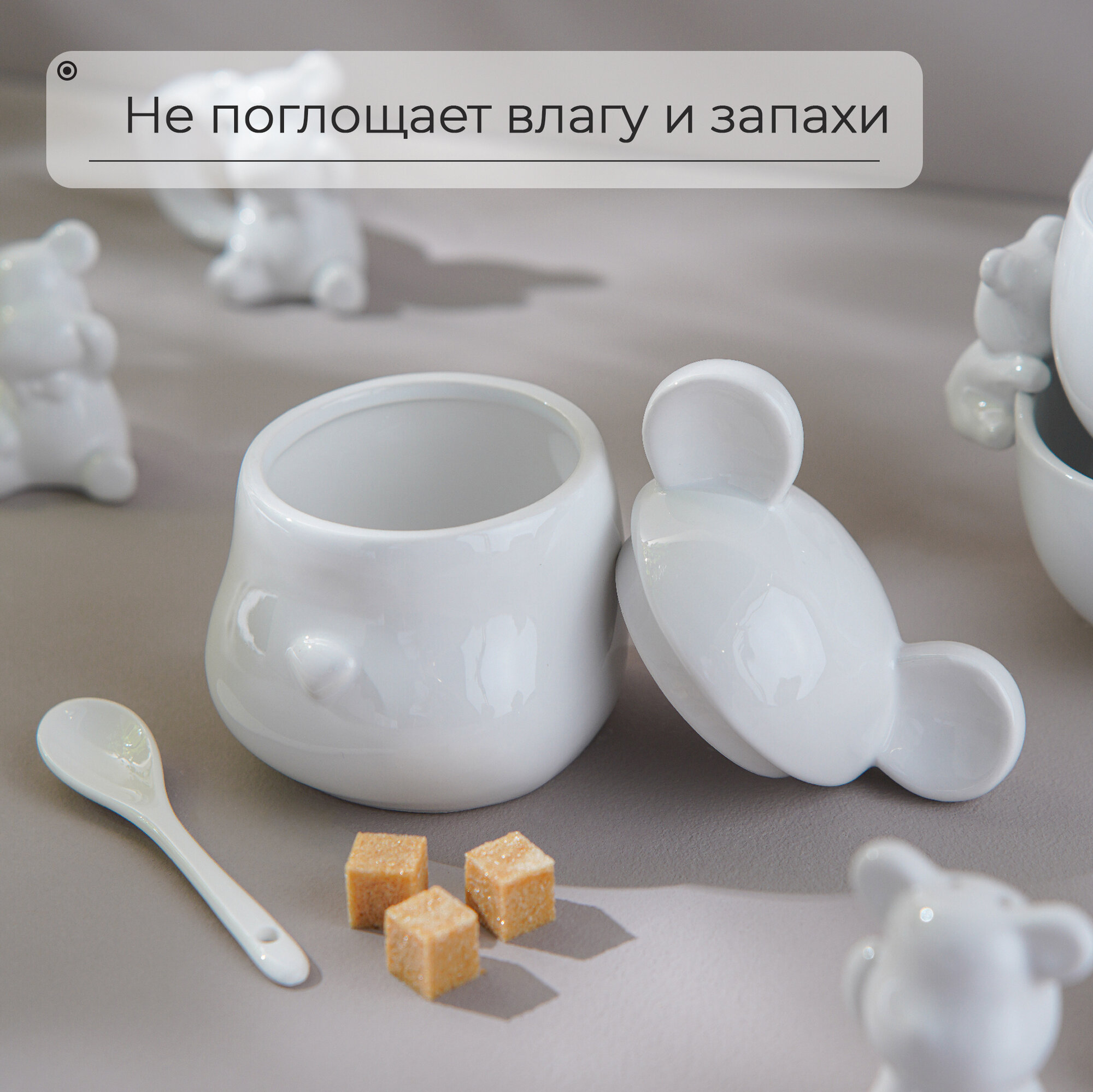 СохранитьСахарница керамическая для сервировки стола, с крышкой и ложкой Доляна «Мишка Отто», 400 мл, 11×12×12,5 см, цвет белый интересное: