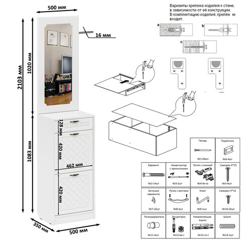 | Особенности | для маленькой прихожей, мягкое сиденье, с местом для сидения, со штангой для вешалок, шкаф с зеркалом |