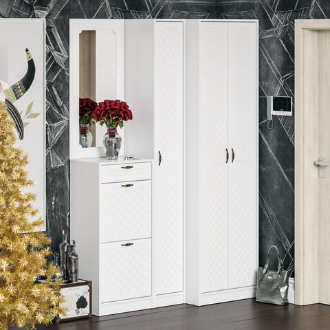 Высокая обувница с зеркалом и пеналом П-6, цвет белая шагрень/фасады МДФ белое дерево фрезеровка ромб, ШхГхВ 80х35х210 см, универсальная сборка