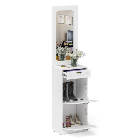 Тумба для обуви 2 секции с зеркалом П-6, цвет белая шагрень/фасады МДФ белое дерево фрезеровка прованс, ШхГхВ 50х35х210 см.