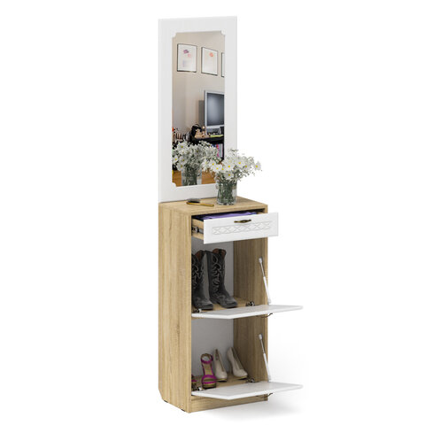 Тумба для обуви 2 секции с зеркалом П-6, цвет дуб сонома/фасады МДФ белое дерево фрезеровка прованс, ШхГхВ 50х35х210 см.