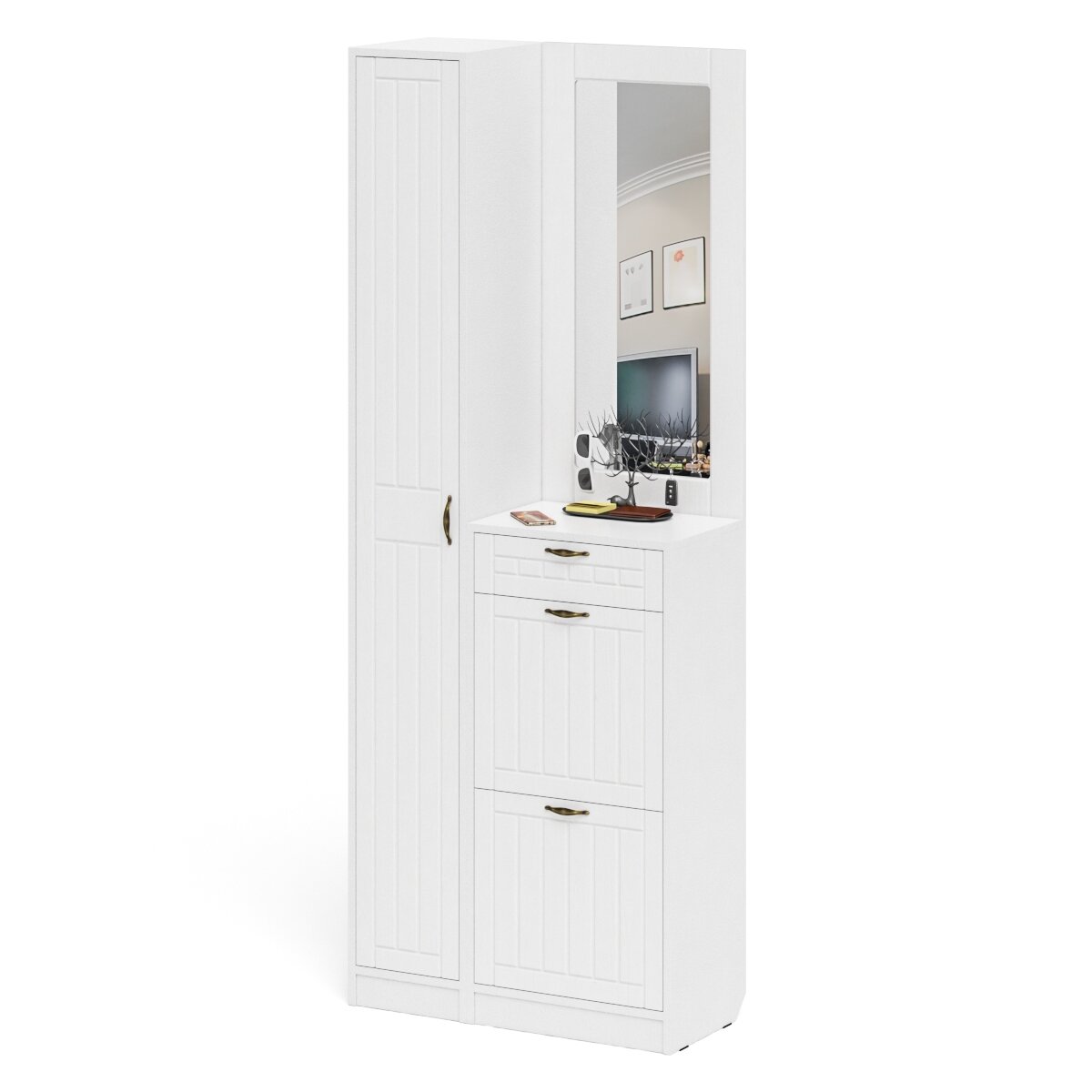 Высокая обувница с зеркалом и пеналом П-6, цвет белая шагрень/фасады МДФ белое дерево фрезеровка прованс, ШхГхВ 80х35х210 см., универсальная сборка