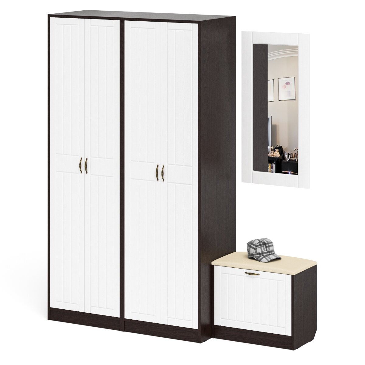 Зеркало для прихожей с обувницей и шкафом П-6, цвет венге/фасады МДФ белое дерево фрезеровка ромб, ШхГхВ 110х50х210 см.