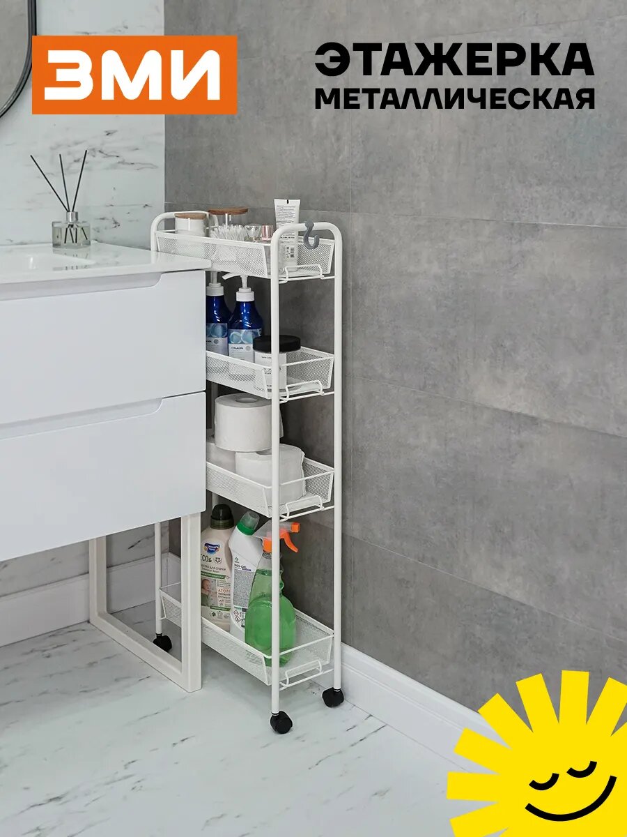 Этажерка ЗМИ Ладья 14К для кухни на колесиках металлическая узкая, белая