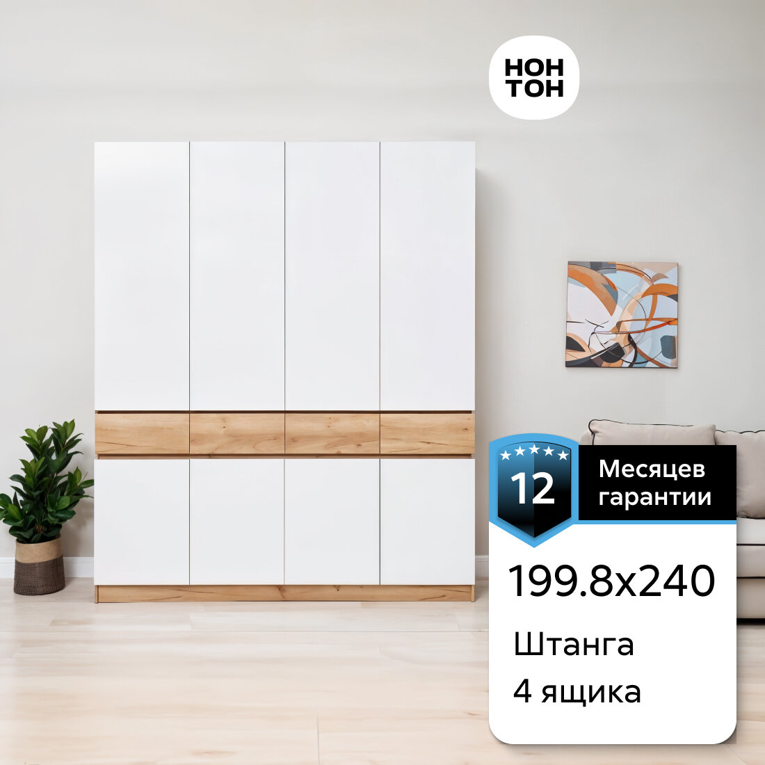 Прихожая Роджина Шкаф 4-х ств распашной Дуб крафт, Белый глянец/Шкаф для одежды с ящиками и штангой