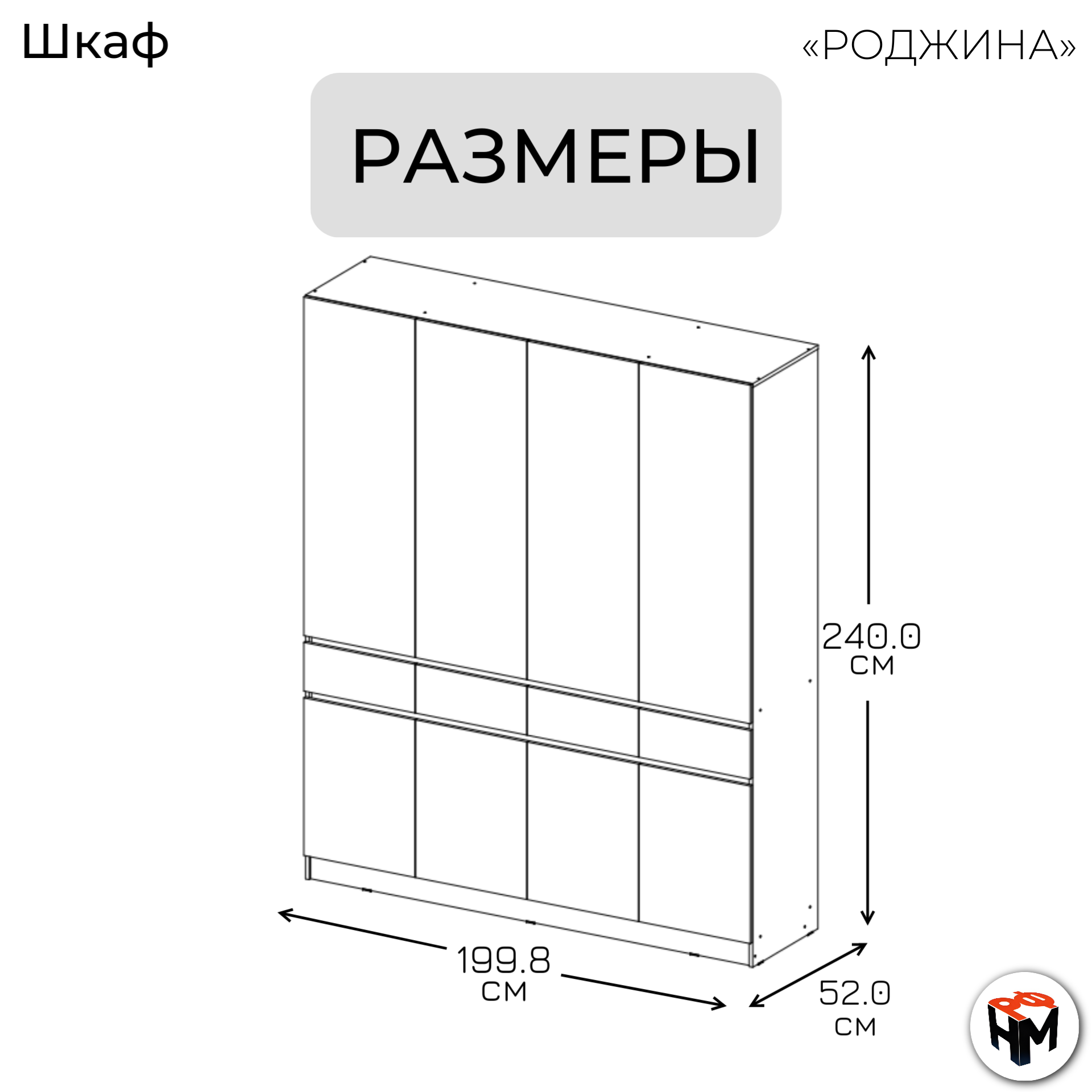| Комплектация | Шкаф распашной имеет 8 дверей, 4 выдвижных ящика на шариковых направляющих, штангу для вешалок |