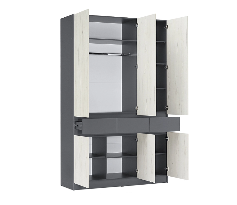 Прихожая Роджина Шкаф 3-х ств Дуб белый крафт, Графит/Шкаф для одежды с ящиками, 150х240х52 см