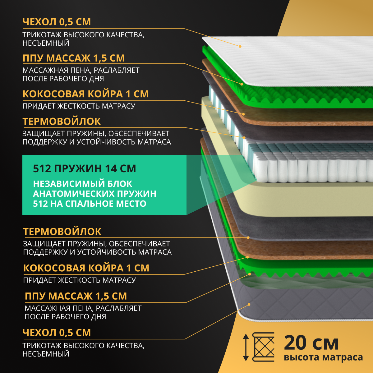 | Дополнительная информация | Состав: Чехол по 0,5 см с каждой стороны Массажная пена 1,5 см Кокосовая койра 1 см Термовойлок 0,5 см Независимый пружинный блок (512 пружин) Термовойлок 0,5 см Кокосовая койра 1 см Массажная пена 1,5 см. Высота: 20 см. Одинаковая жесткость сторон: средняя. Максимальная нагрузка на одно спальное место: 130 кг. Матрас доставляется в производственной вакуумной упаковке, в рулоне. |
