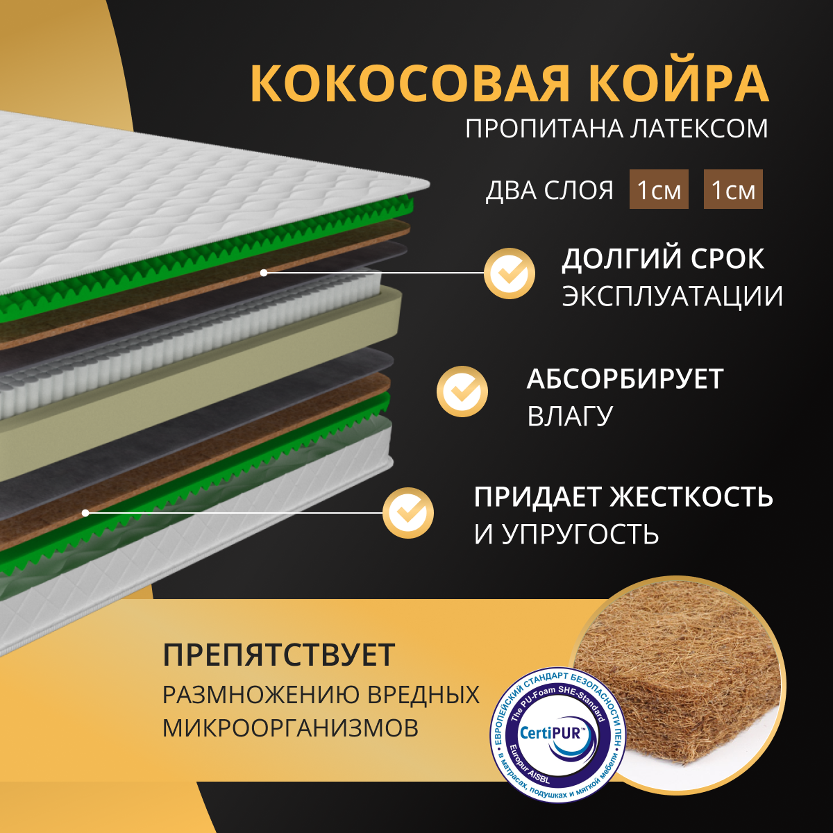 Матрас YANSON Massage Cocos Line 70х180 ортопедический пружинный c независимым блоком пружин, кокосовая койра и ппу