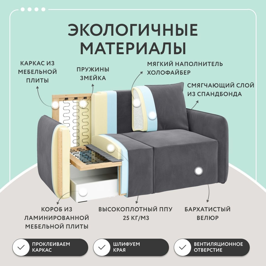 Диван-кровать раскладной прямой Портленд мини в гостиную, аккордеон-евро, велюр, серый, 163х90х80