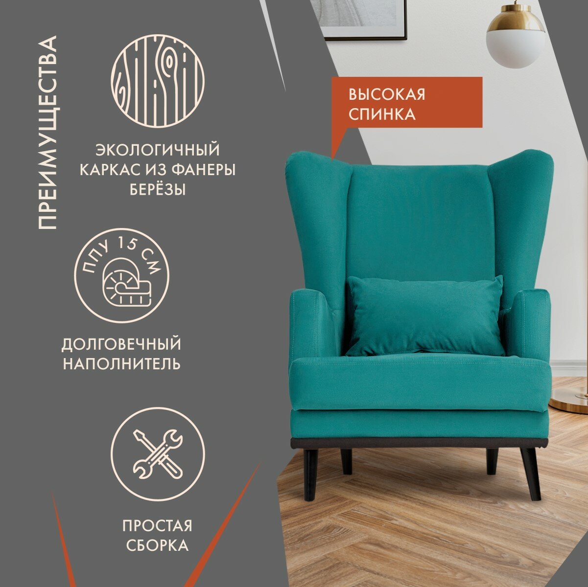 Кресло Оскар мягкое для отдыха дома, на ножках, велюр Velvet Mint 03, 75х85х90 (ШхГлхВ)