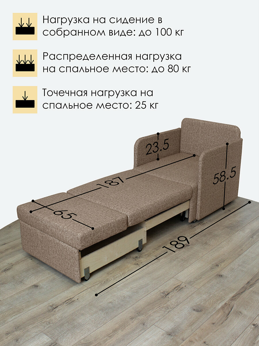 | Дополнительная информация | Обращаем Ваше внимание, что в разложенном виде кресло-кровать может скользить на глянцевом полу, т.к. стоит на двух ножках и колесах. Размер и конструкция колес не предполагает наличие стопора (тормоза). В комплект входят два антискользящих подпятника, которые нужно приклеить на задние ножки. |