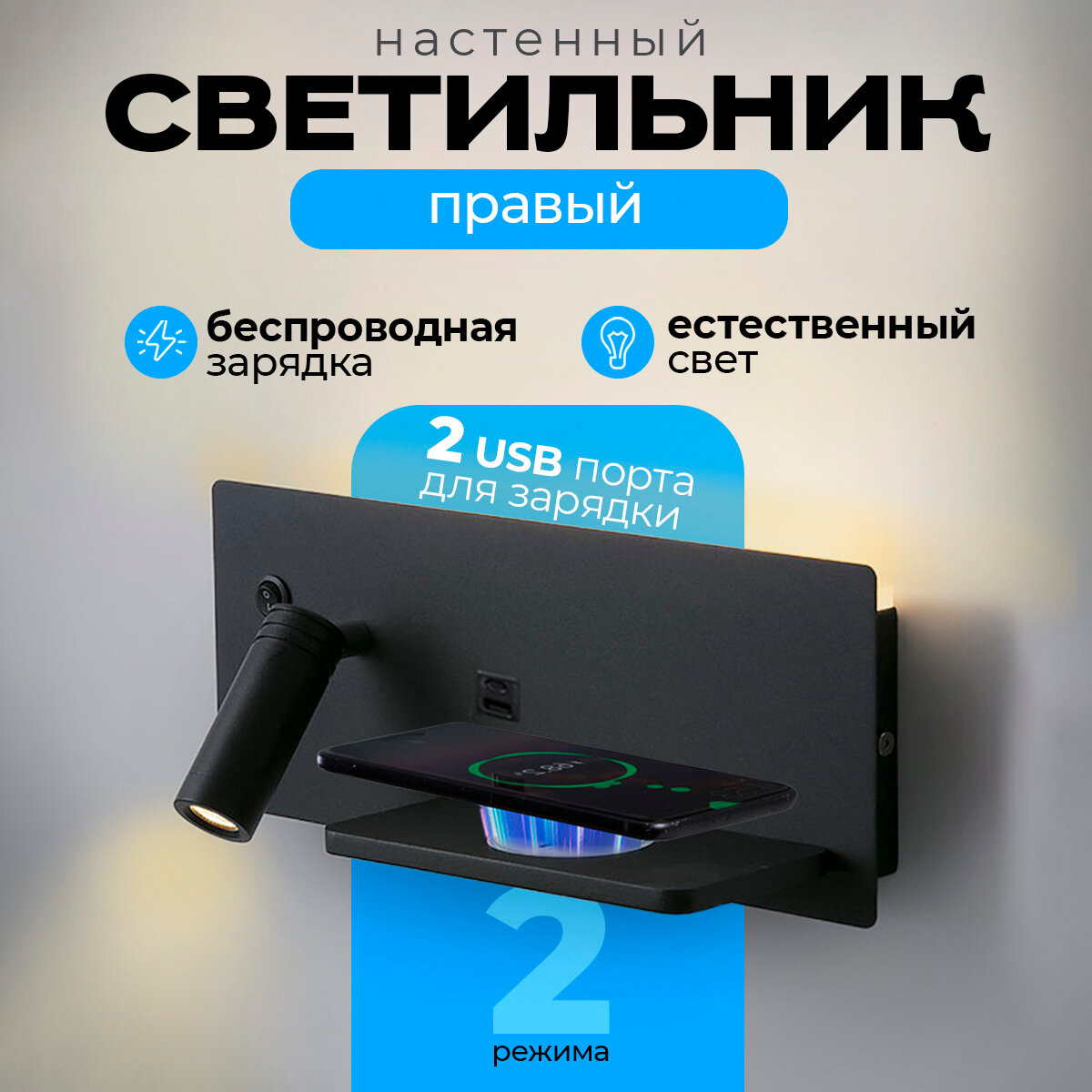 СохранитьНастенный светильник с выключателем, беспроводной зарядкой и USB портами SBZ-2 Black черный, левый + правый прикроватный интересное: