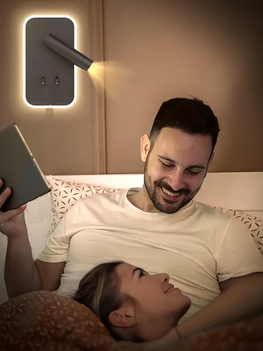 Настенный светильник с выключателем, беспроводной зарядкой и USB портами SBZ-2 Black черный, левый + правый прикроватный