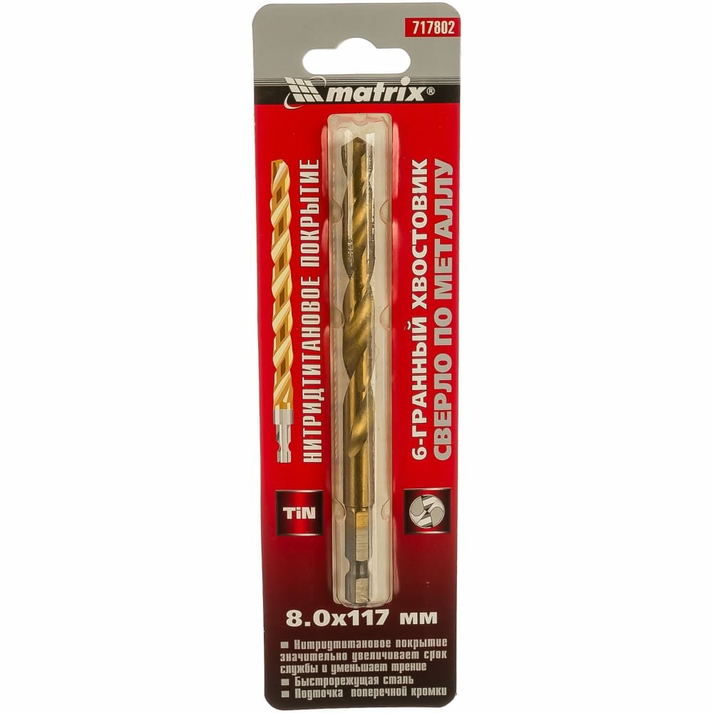Сверло по металлу Matrix 8 мм, HSS, нитридтитановое покрытие, 6-гранный хвостовик 717802