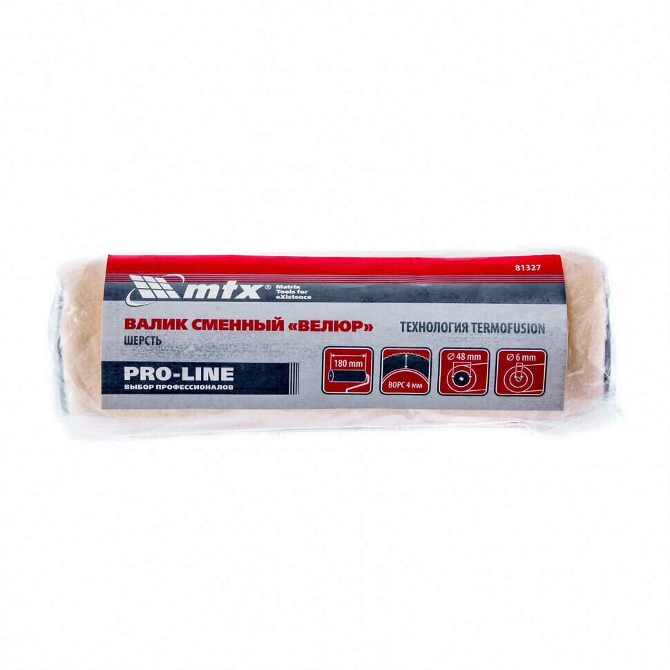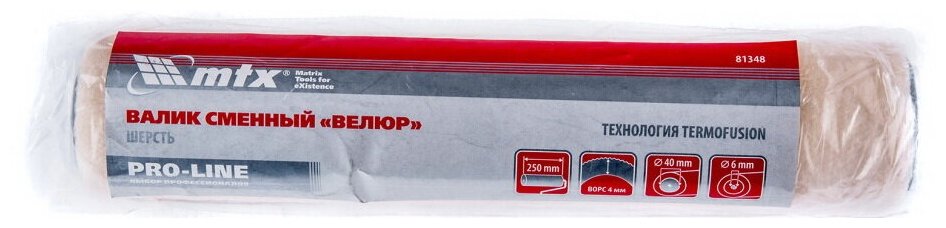 Купить Валик сменный Велюр Pro, 250 мм, ворс 4 мм, D 40 мм, D ручки 6 мм, шерсть 50%, полиакрил 50% MTX 81348
