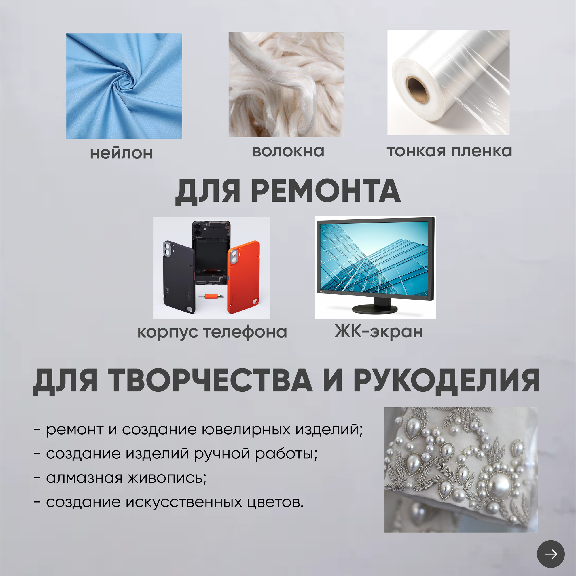 | Материалы для склеивания | ДСП / ПВХ / бумага / дерево / камень / керамика / кожа / металл / оргалит / оргстекло / пенополистирол / пластик / полиуретан / пробка / резина / стекло / ткань / фарфор |