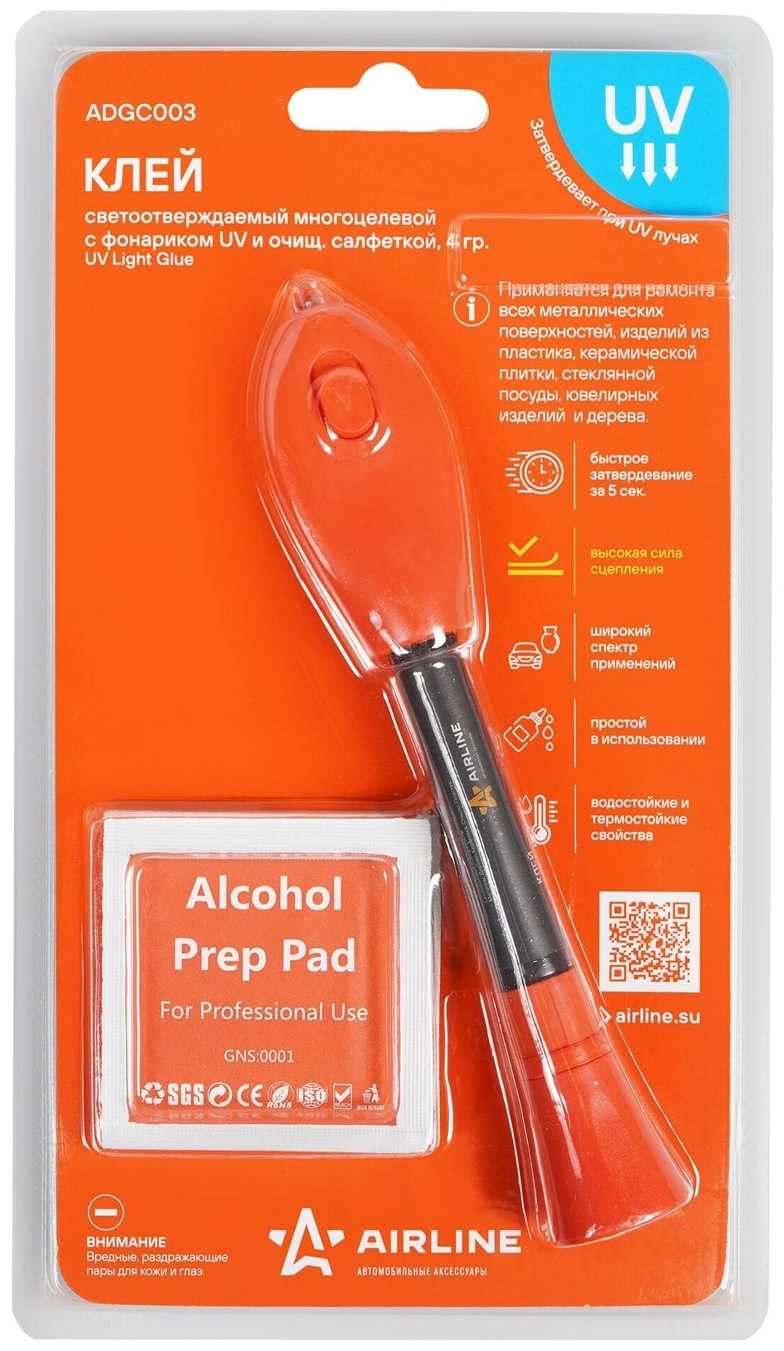 Клей светоотверждаемый многоцелевой c фонариком UV и очищ. салфеткой, 4 гр. ADGC003 AIRLINE