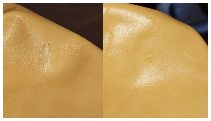 | Отзыв: | Замаскировал небольшой порез на подлокотнике. Сперва приклеил края Моментом изнутри к мягкой подложке встык, затем заполнил впадинку жидкой кожей в 4 слоя, стык практически незаметен. |