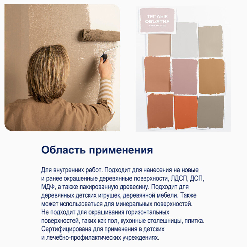 | Дополнительная информация | 2 в 1: грунт + краска, не требует грунта на новых и ранее окрашенных материалах; хранение: 3 года при температуре от +5 °С до +30 °С в невскрытой заводской упаковке; влажную уборку окрашенной поверхности начинайте не ранее 14 дней после окрашивания, покрытие выдерживает интенсивную влажную уборку с мягкими моющими средствами (раствор мыла, шампуня, геля для душа), не рекомендуется использовать абразивные материалы, не оставляйте поверхность мокрой после очистки; без запаха; плотность: 1,25 кг/л |