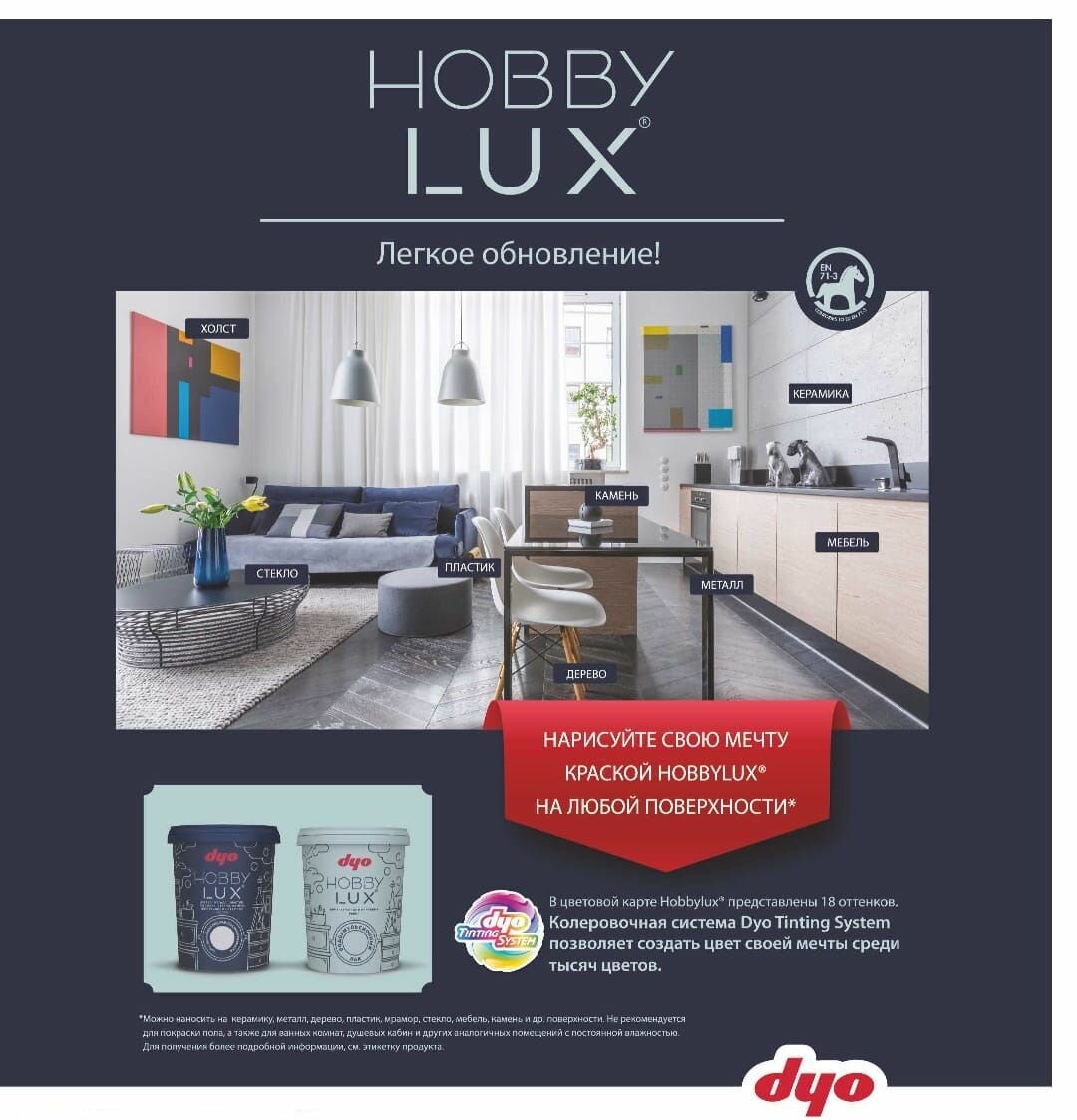 Ниже Вы можете прочитать отзывы на Краска "Dyo" шелковисто-матовая, для любых поверхностей "HOBILUX" цвет белый 0,4л, ознакомится с подробными характеристиками, посмотреть интересные обзоры и фотографии на Краска "Dyo" шелковисто-матовая, для любых поверхностей "HOBILUX" цвет белый 0,4л.