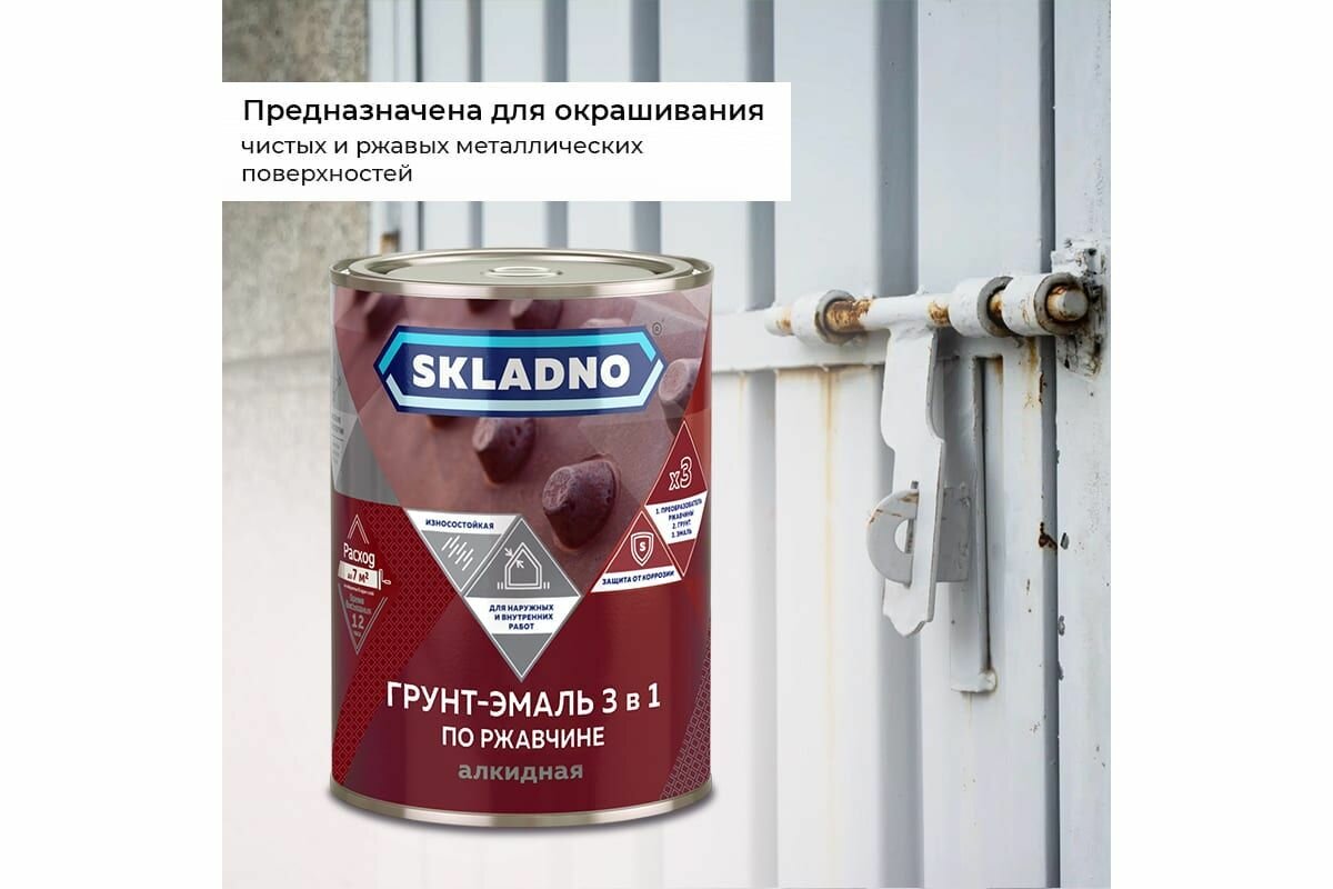 Грунт-эмаль по ржавчине 3 в 1 Skladno, 0,8 кг, коричневая, глянцевая, алкидная, 1шт, жестяная банка