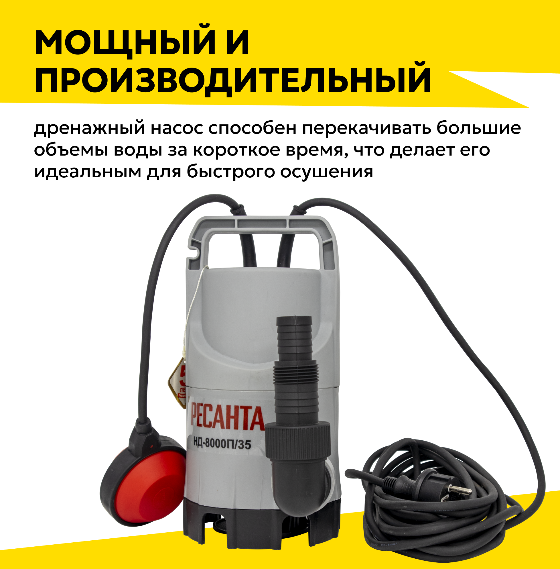 Насос дренажный погружной РЕСАНТА НД-15500П/35 для грязной воды (258 л/мин, с поплавковым выключателем) для откачки воды из водоемов, шахт, подвалов, помещений, бассейнов / для дома и дачи