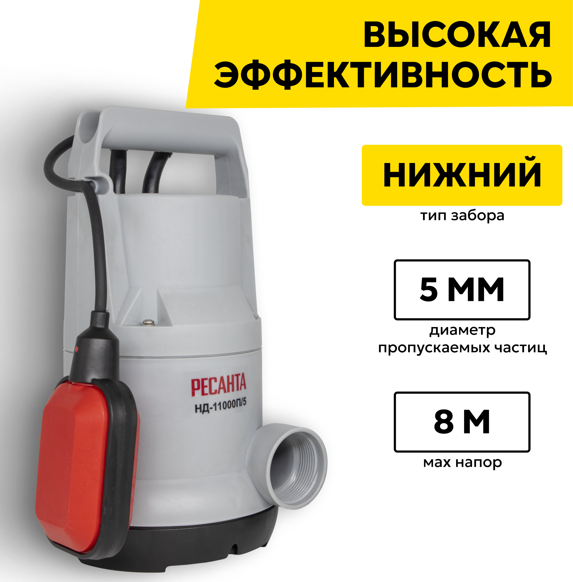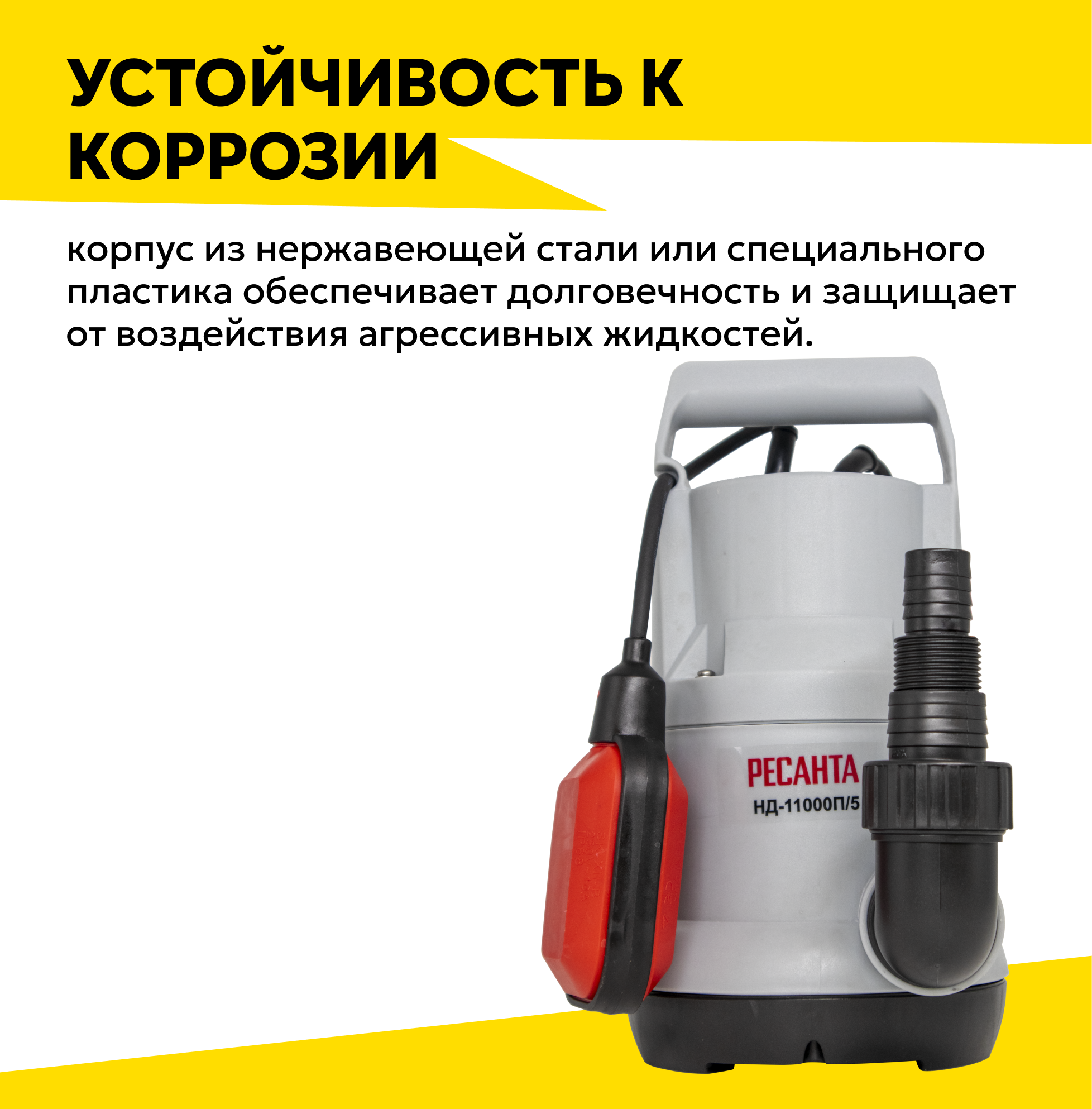 Насос / Дренажный насос НД-11000П/5 Ресанта (400 Вт, макс. напор – 8 м, 11000 л/час, для чистой воды, диаметр пропускаемых частиц – 5 мм, 1.5“)